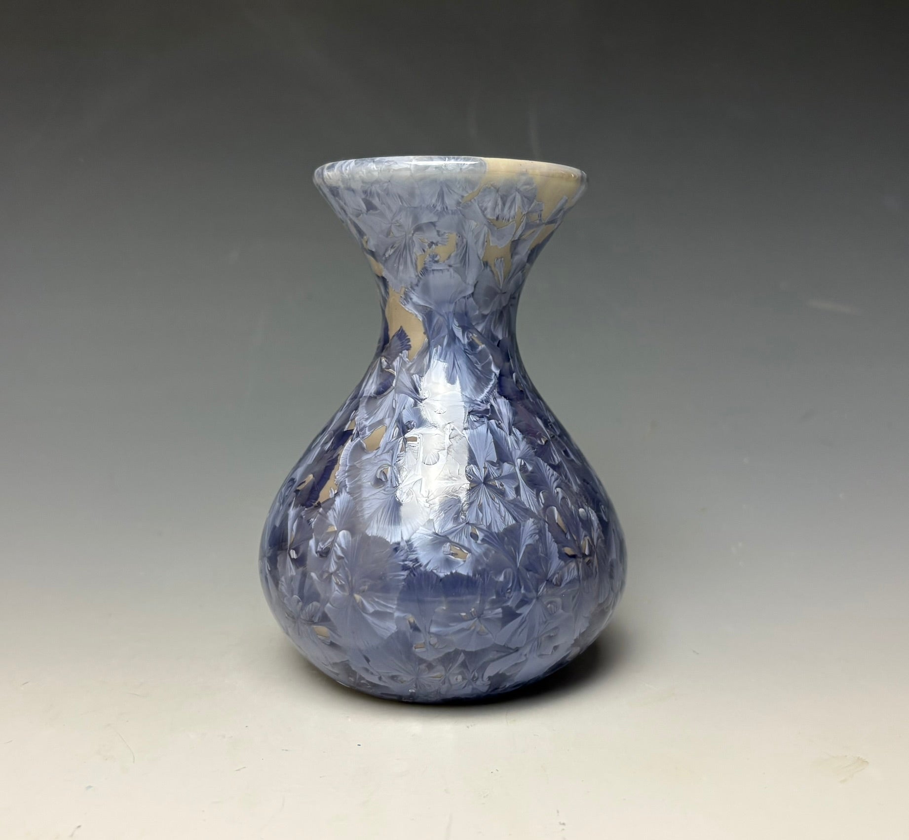 This vase was hand-made from porcelain clay on the potter's wheel. Due to the unique nature of crystalline glazes, no two pieces are ever alike. The zinc crystals are actually grown during the firing and cooling process. The time and temperature must be accurate in order to achieve crystal growth on the piece.