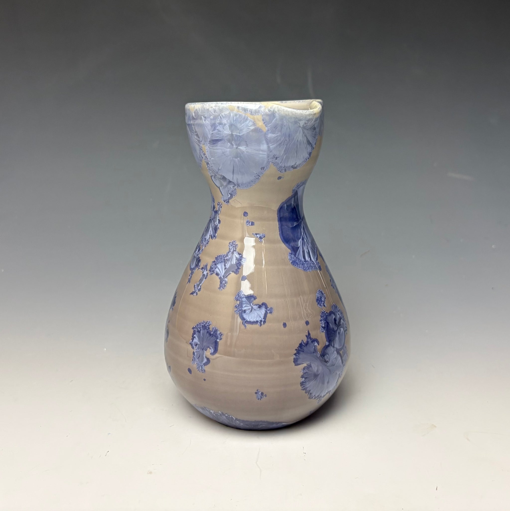 This piece was hand made on the potter’s wheel from porcelain clay. The zinc crystals covering the surface of the piece are a unique combination of light purple/periwinkle crystals on a light tan/mauve background. This glaze really glows in the light!