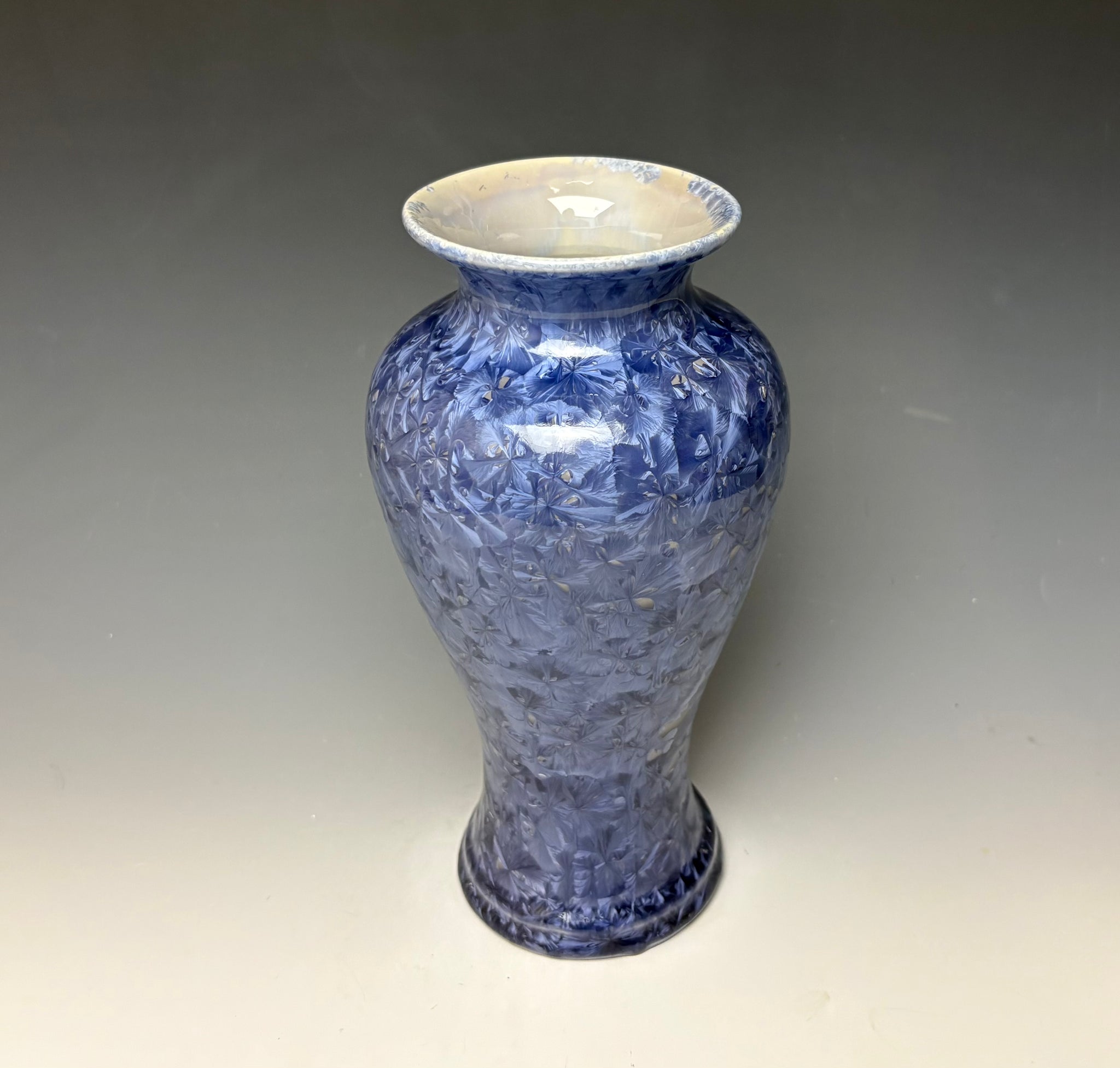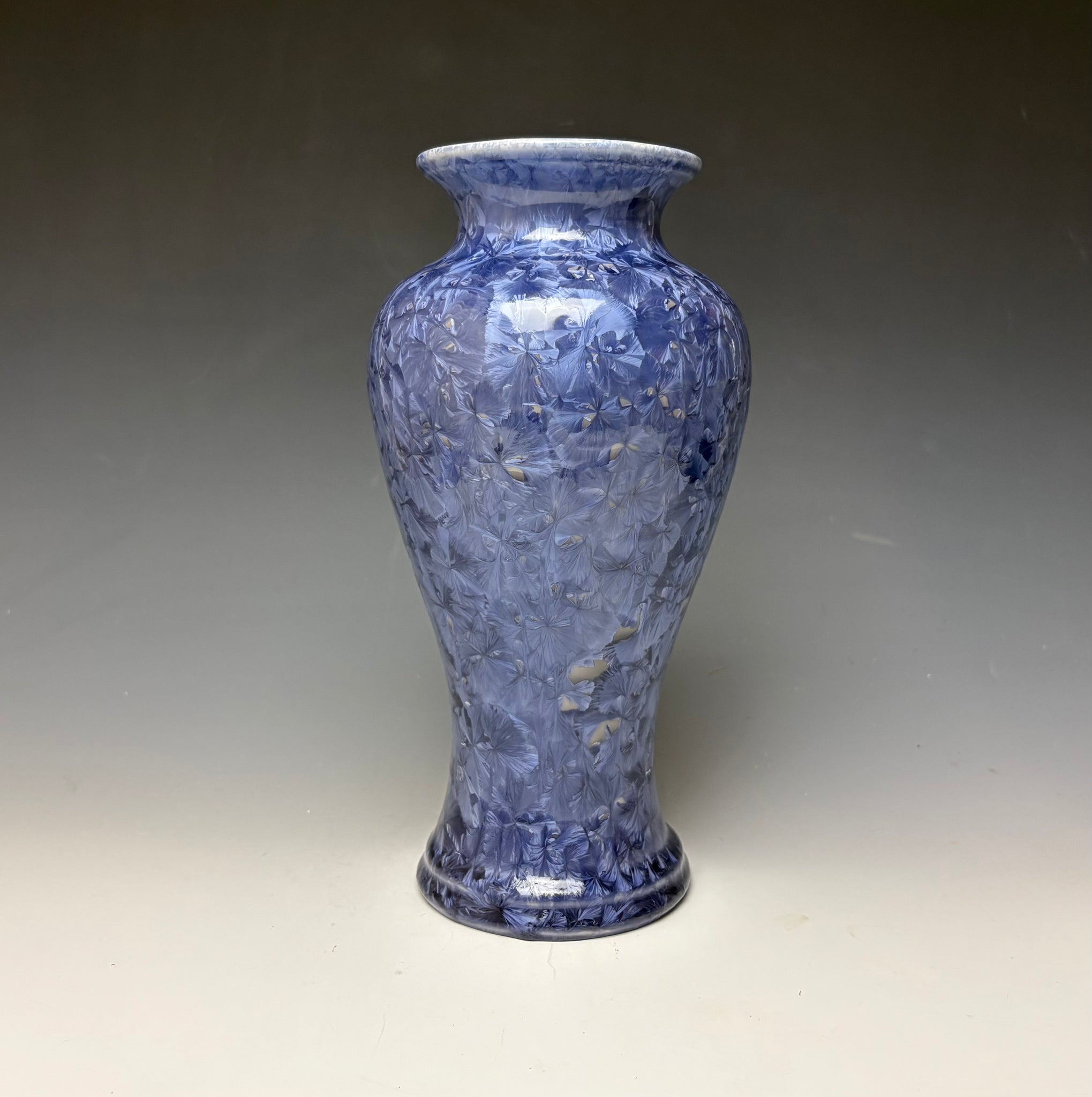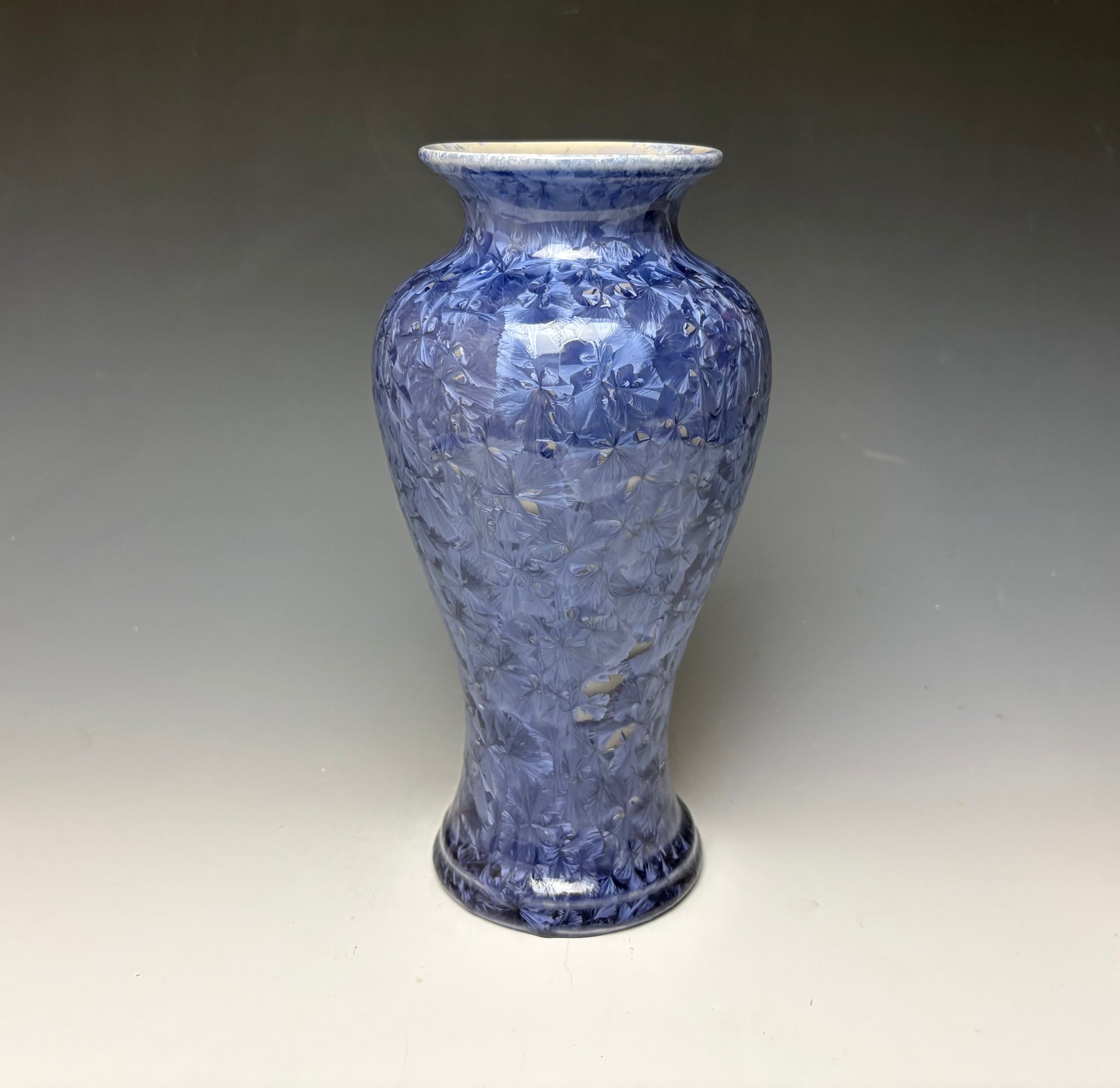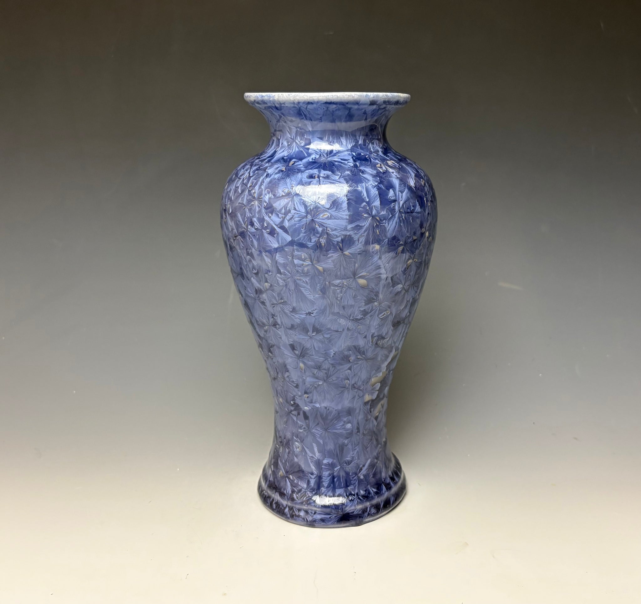 This vase was hand-made from porcelain clay on the potter's wheel. Due to the unique nature of crystalline glazes, no two pieces are ever alike. The zinc crystals are actually grown during the firing and cooling process. The time and temperature must be accurate in order to achieve crystal growth on the piece.