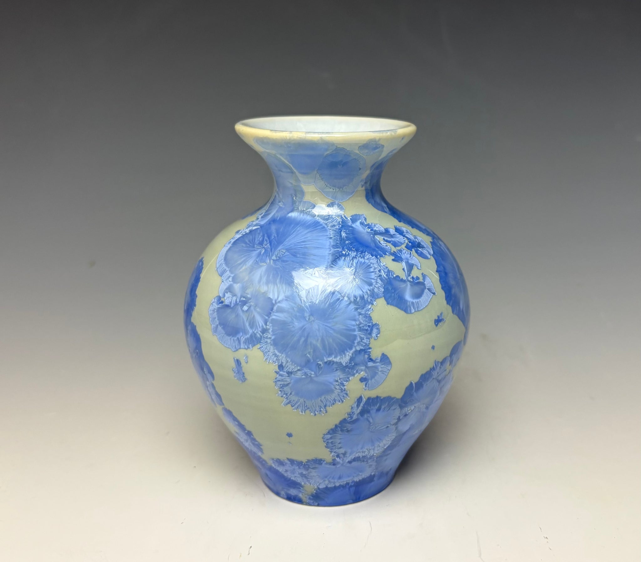 This piece was hand made on the potter’s wheel from porcelain clay. The vase has light blue and powder blue colored crystals on a light blue background. The crystals you see on the vase are actual zinc crystals that were formed during the firing!