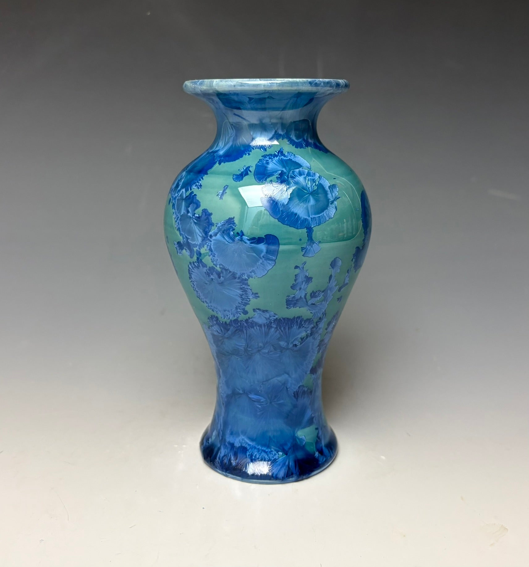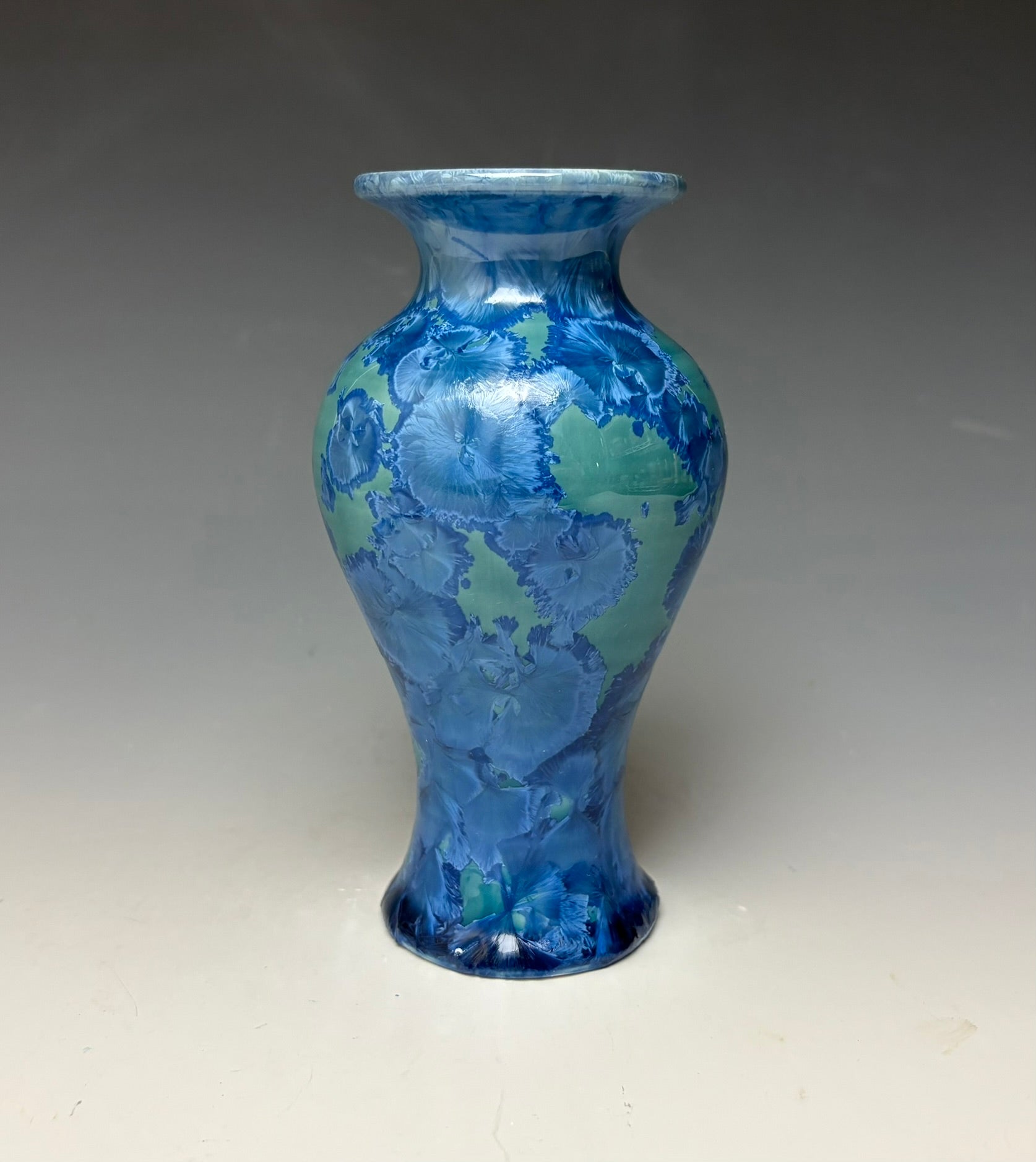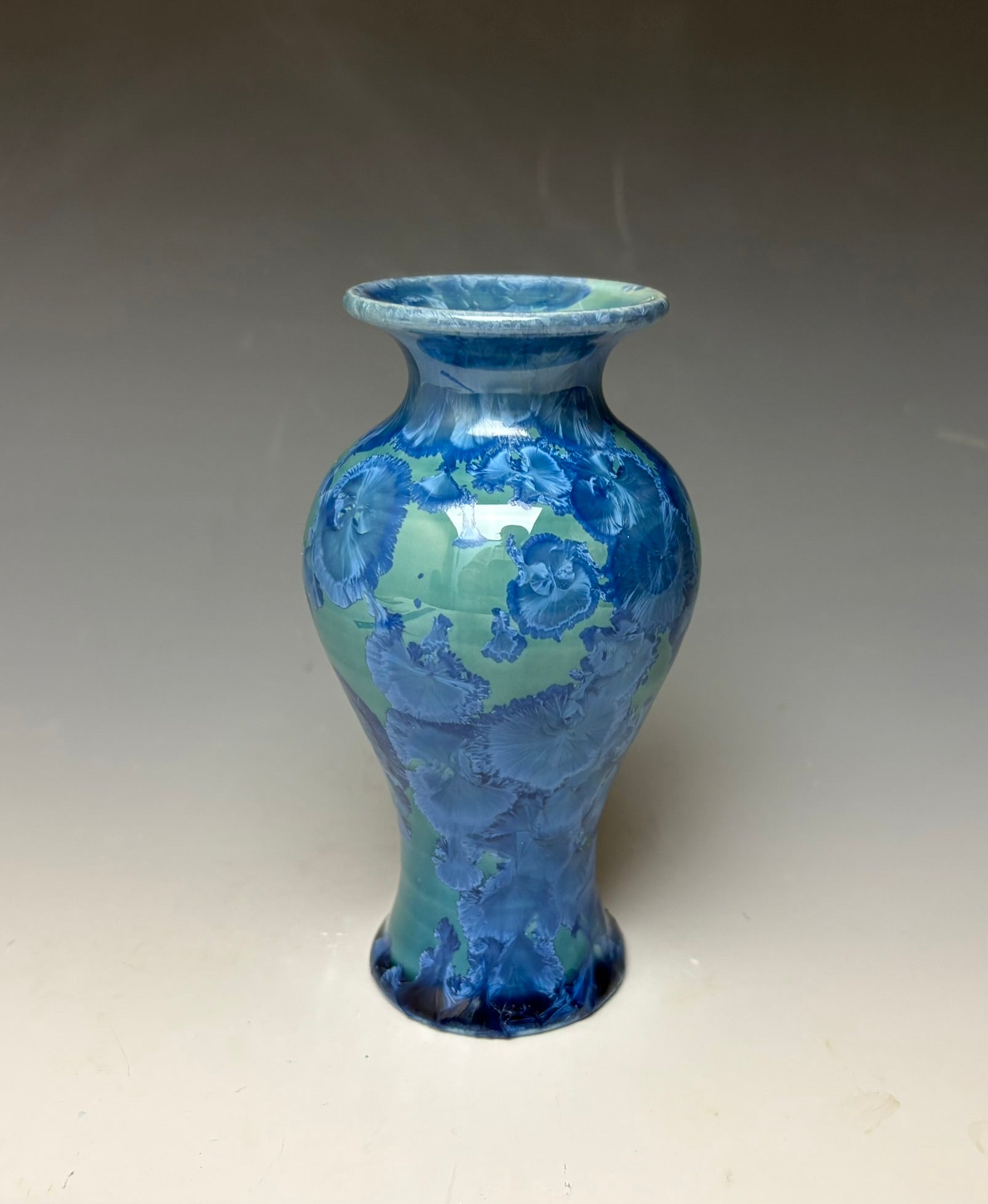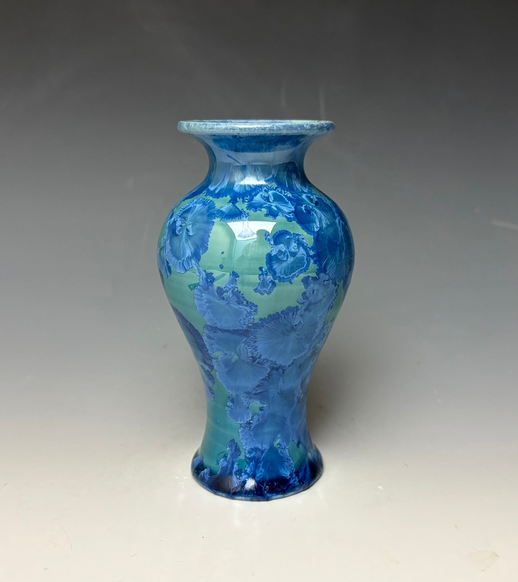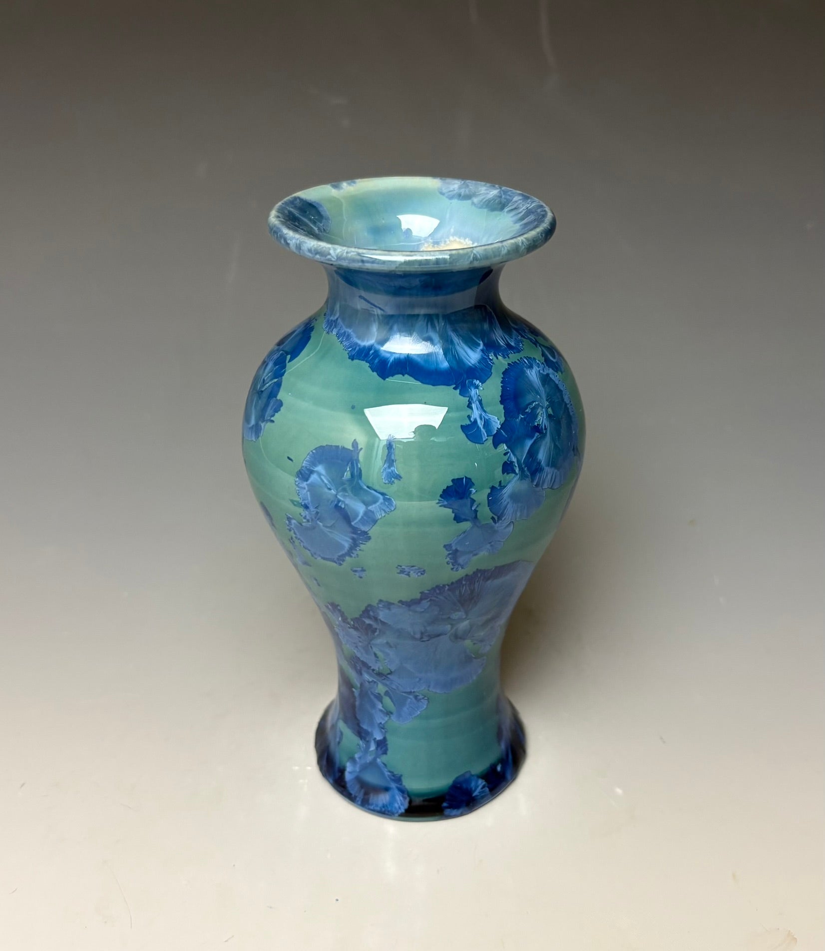 This piece was handmade on the potter's wheel by Lindsey from porcelain clay. It is glazed with a light blue crystalline glaze with crystals wrapping around the vase that gives a multitude of depth and dimension to this piece. It has light blue crystals on light blue/teal background with a blue and white interior.