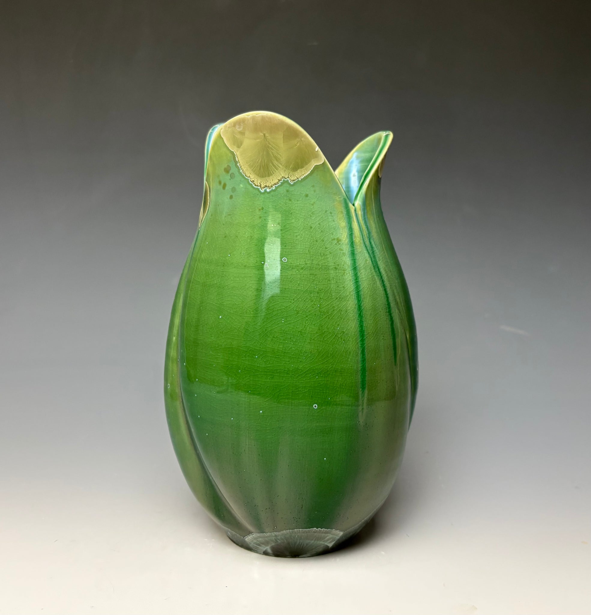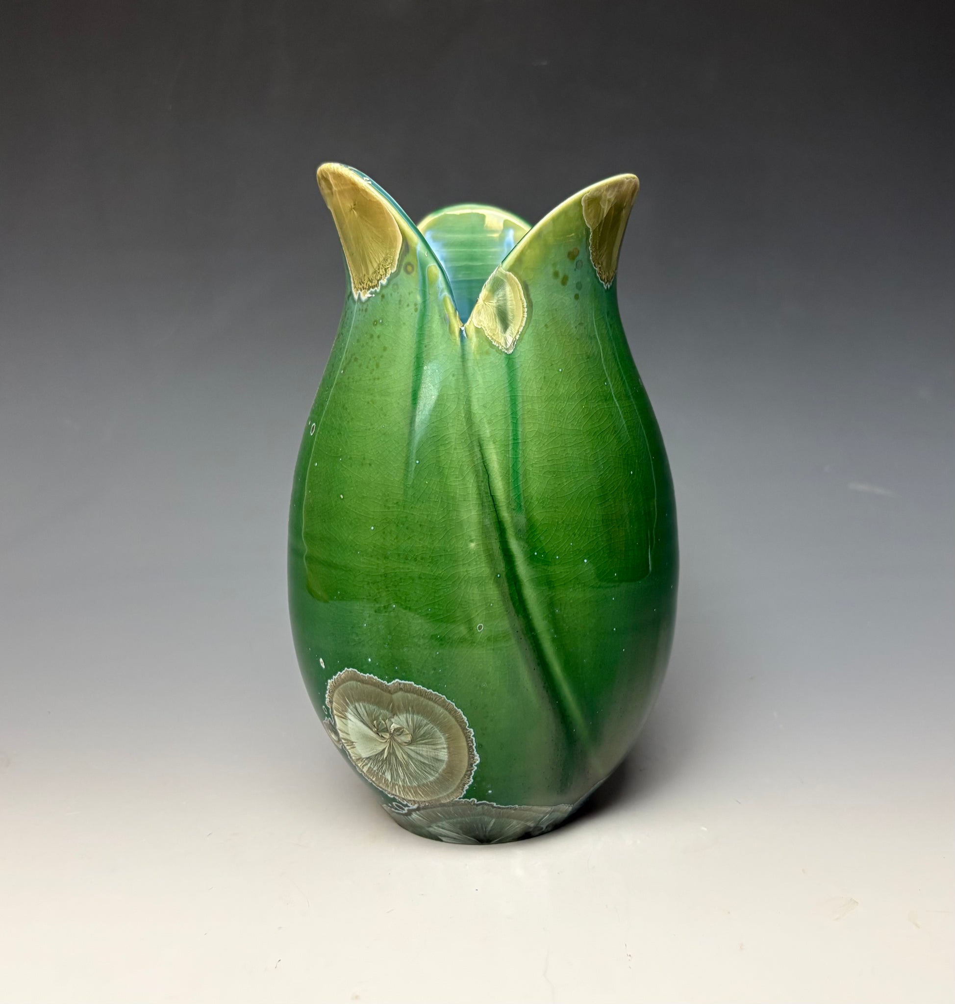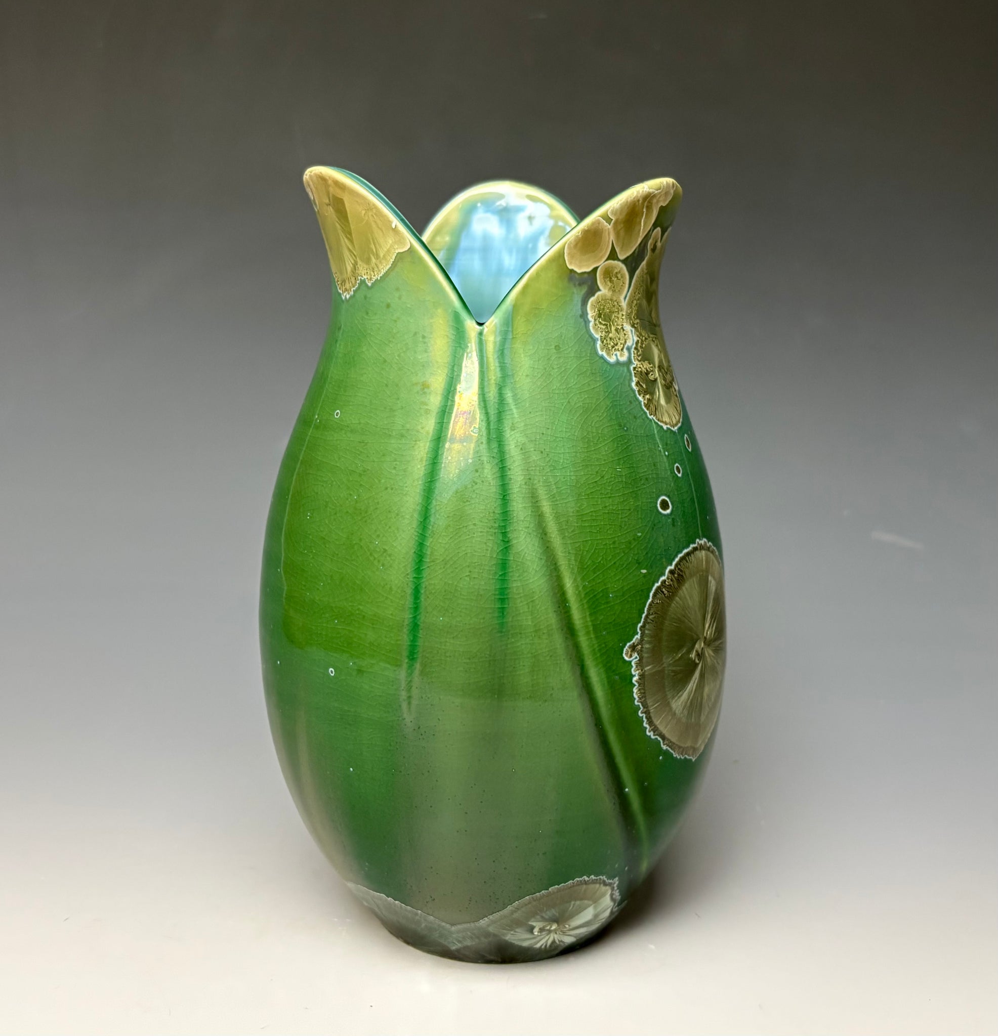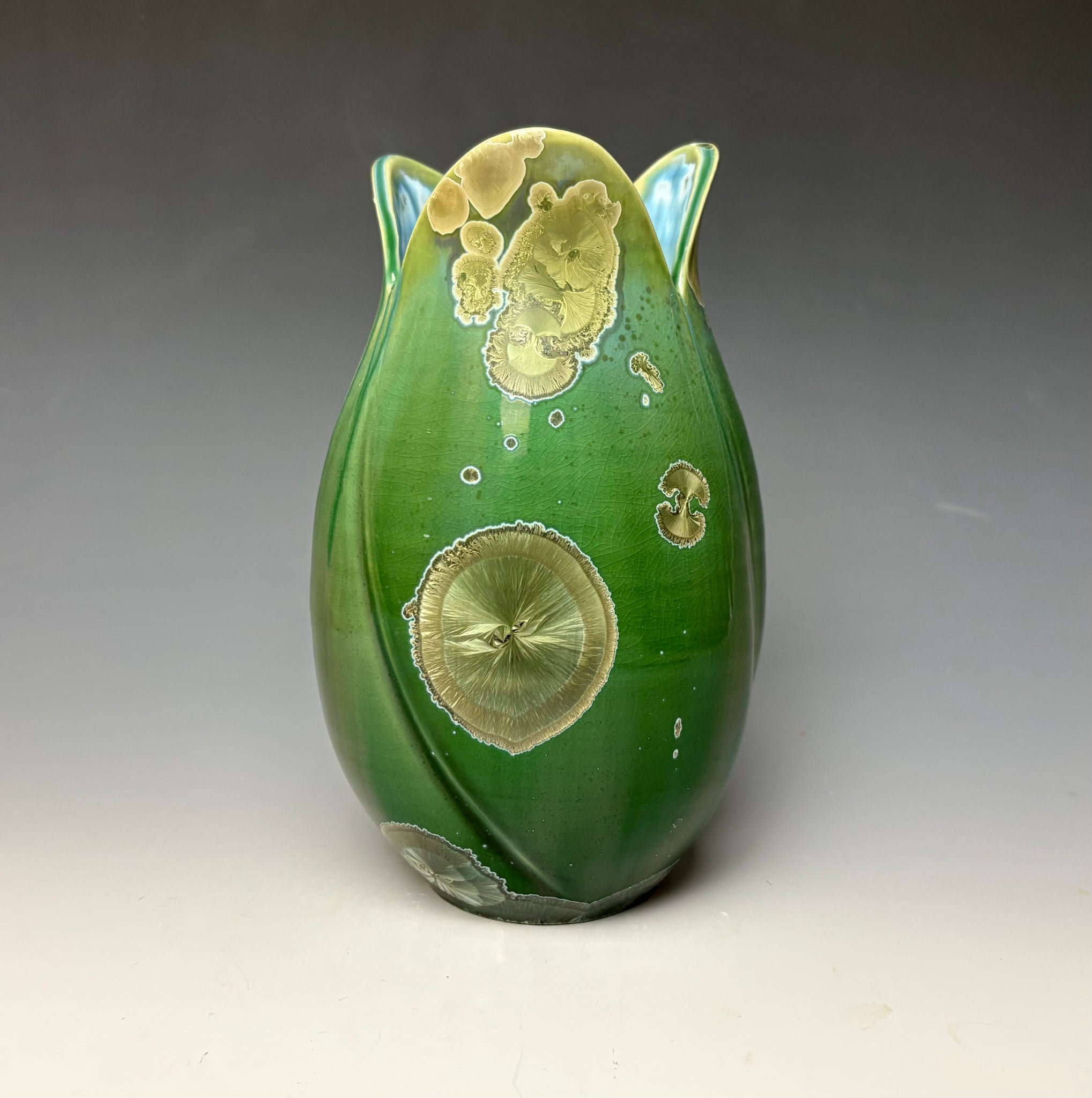 This vase was hand-made from porcelain clay on the potter's wheel. The clay was cut and altered to create the tulip-like shape. Due to the unique nature of crystalline glazes, no two pieces are ever alike. The zinc crystals are actually grown during the firing and cooling process. The time and temperature must be accurate in order to achieve crystal growth on the piece.