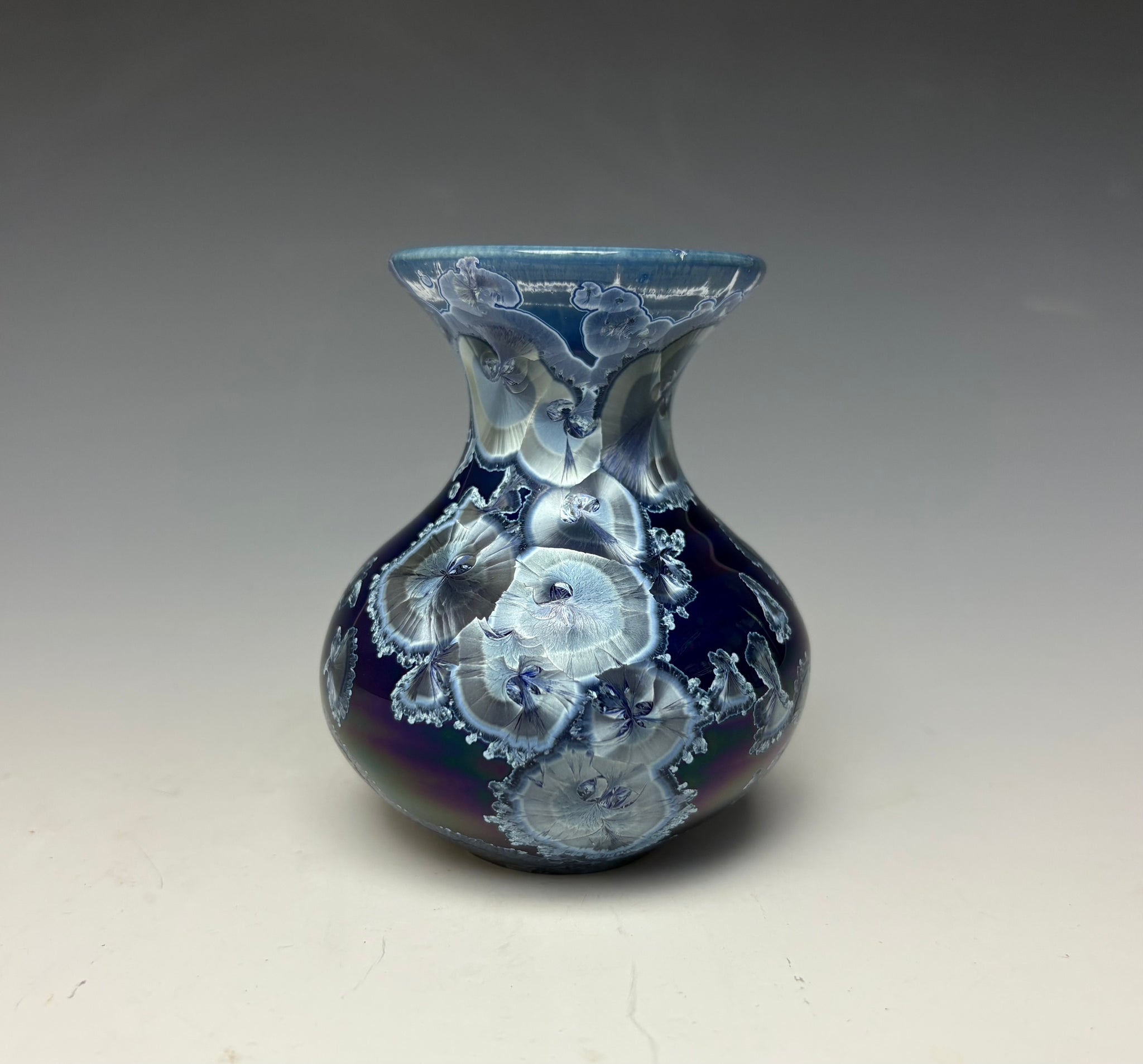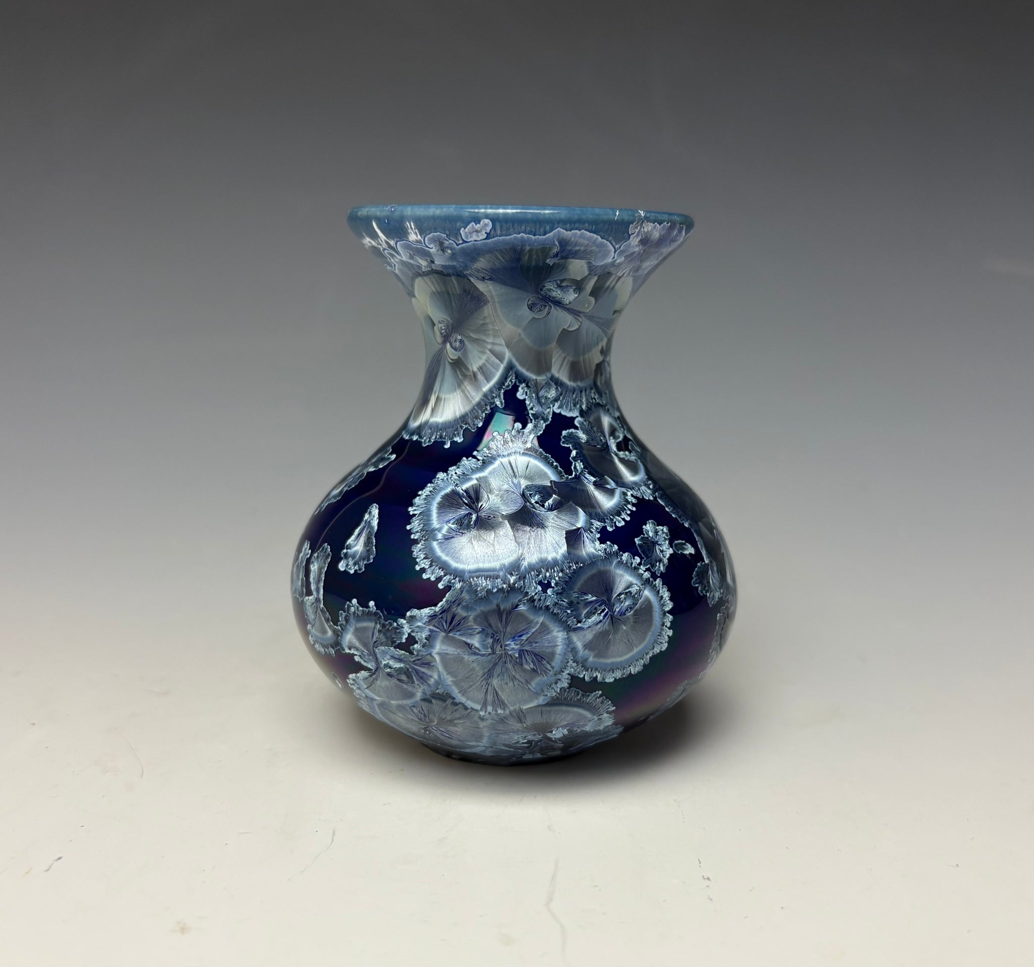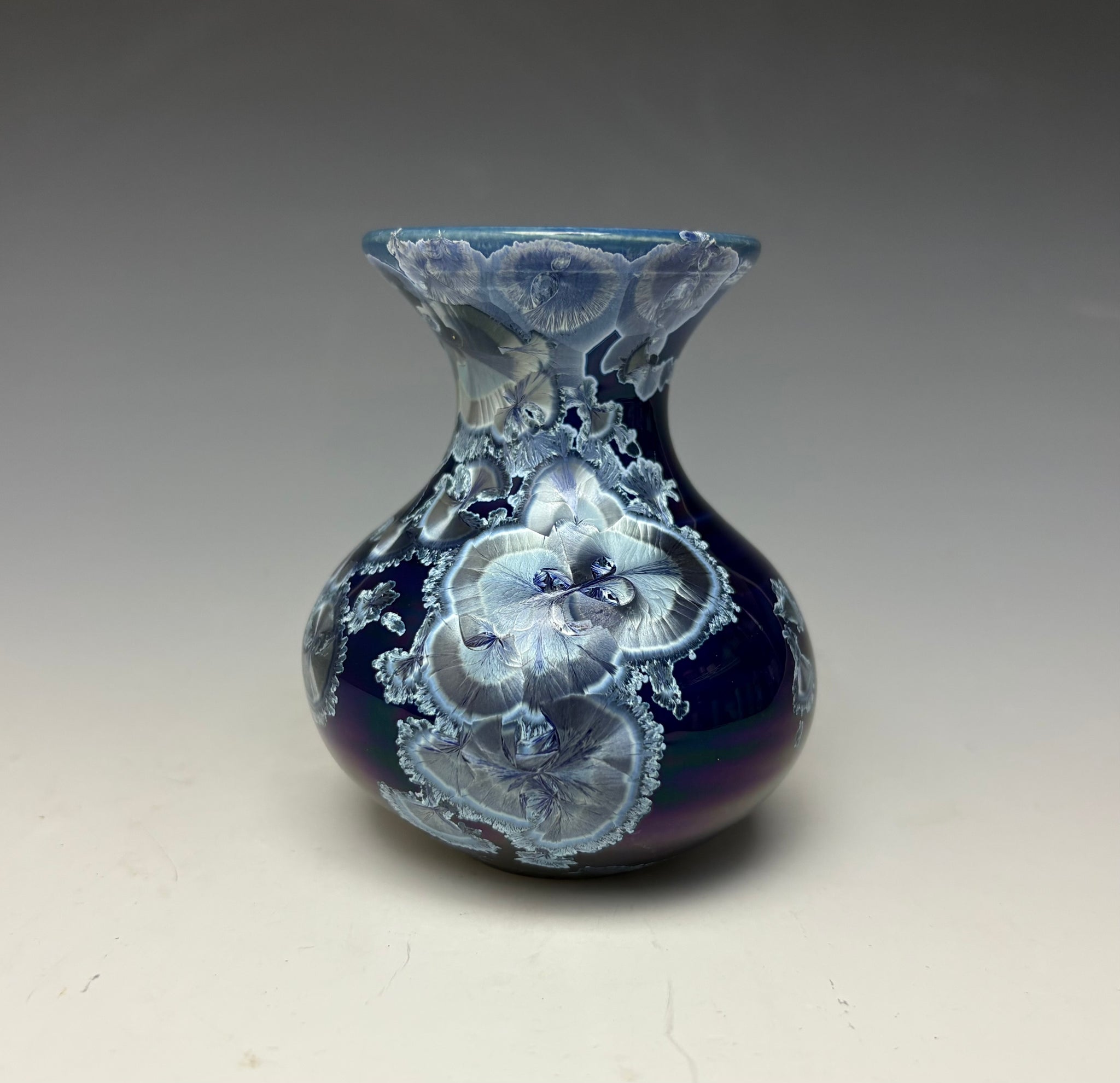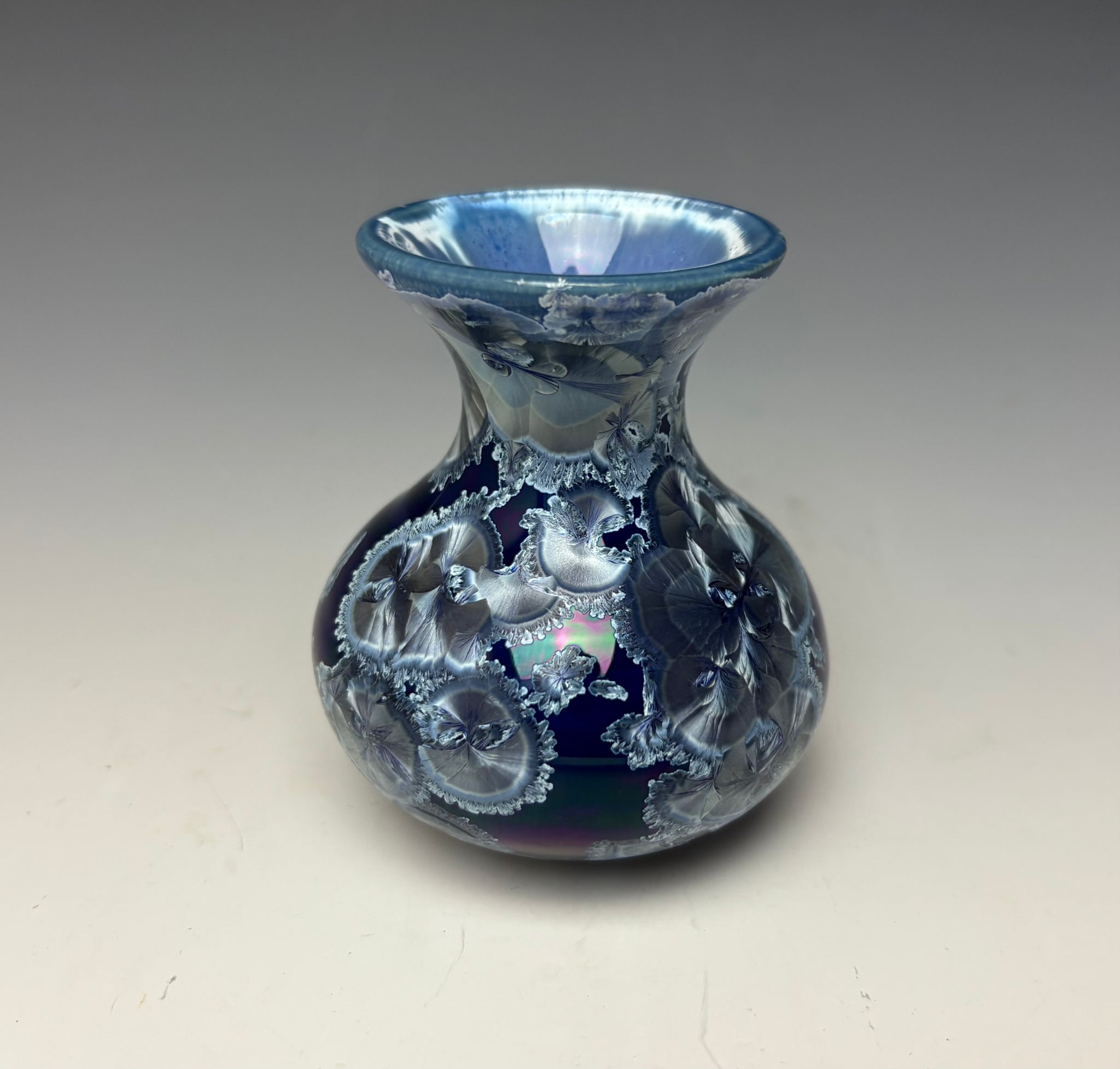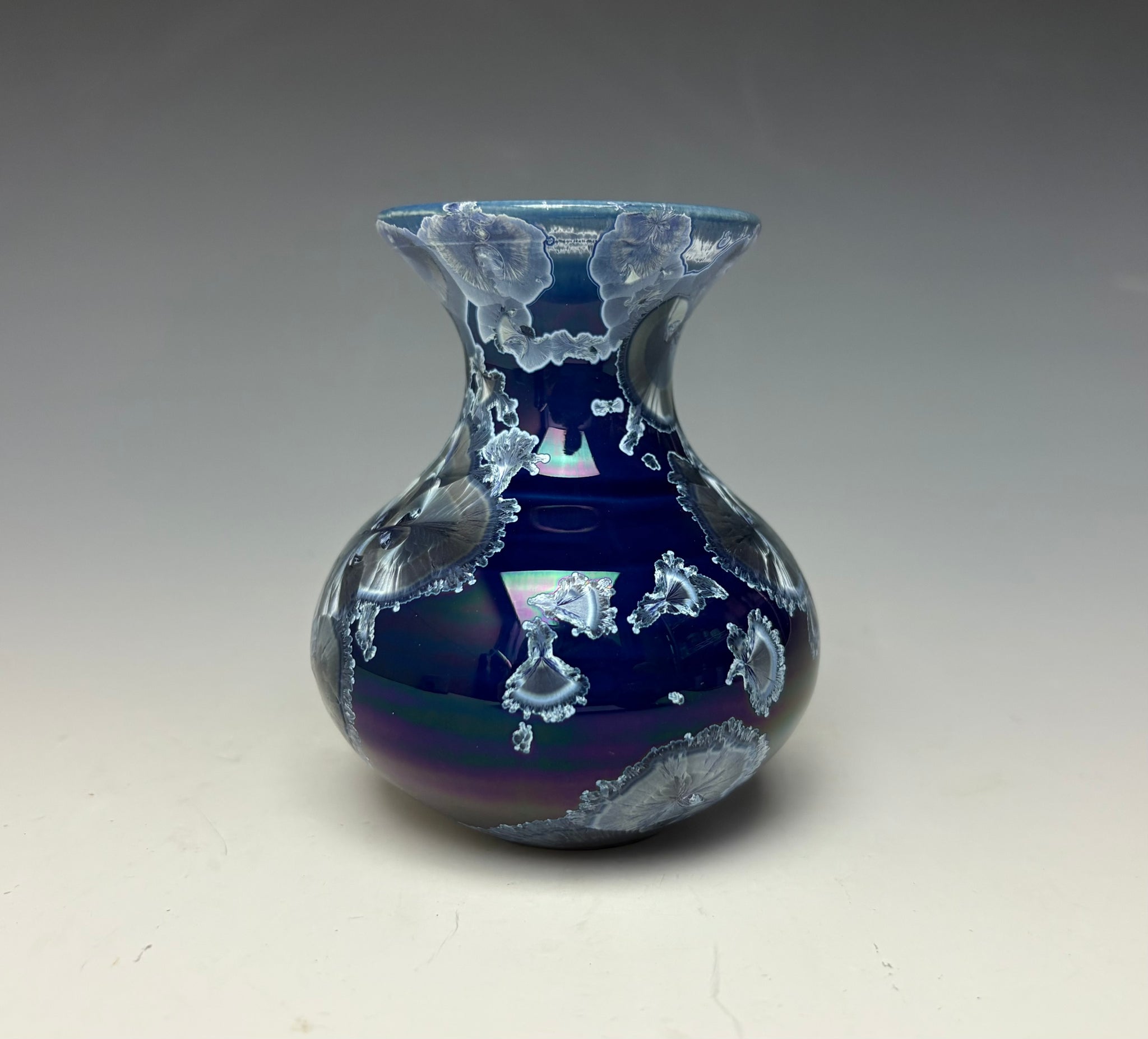 The piece has lovely royal blue/silver zinc crystals on a royal blue background. These crystals actually GROW during the firing and cooling process! No two pieces are ever alike. The bright blue crystals have a silver shimmer and dance about the dark blue background.