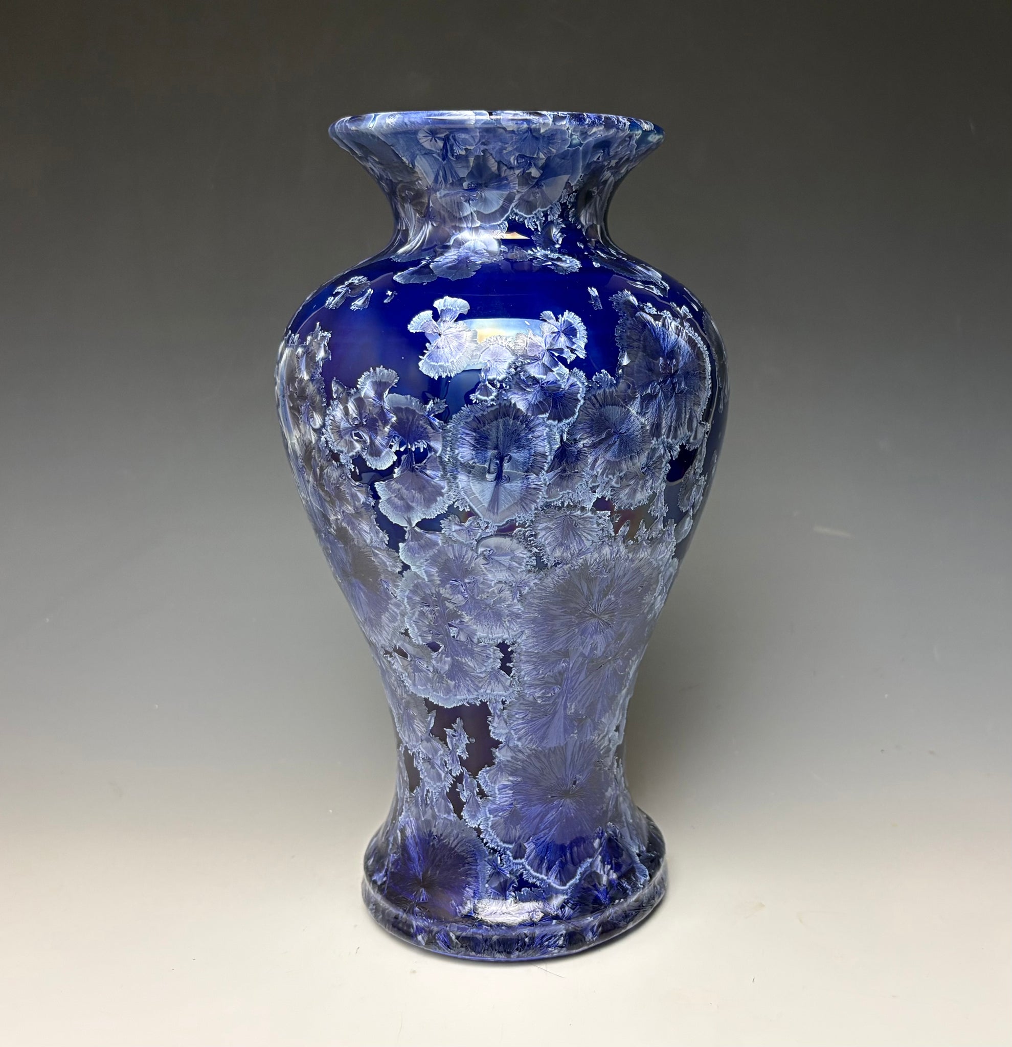 The piece has lovely royal blue/silver zinc crystals on a royal blue and white background. These crystals actually GROW during the firing and cooling process! No two pieces are ever alike. The bright blue crystals have a silver shimmer and dance about the dark blue background.