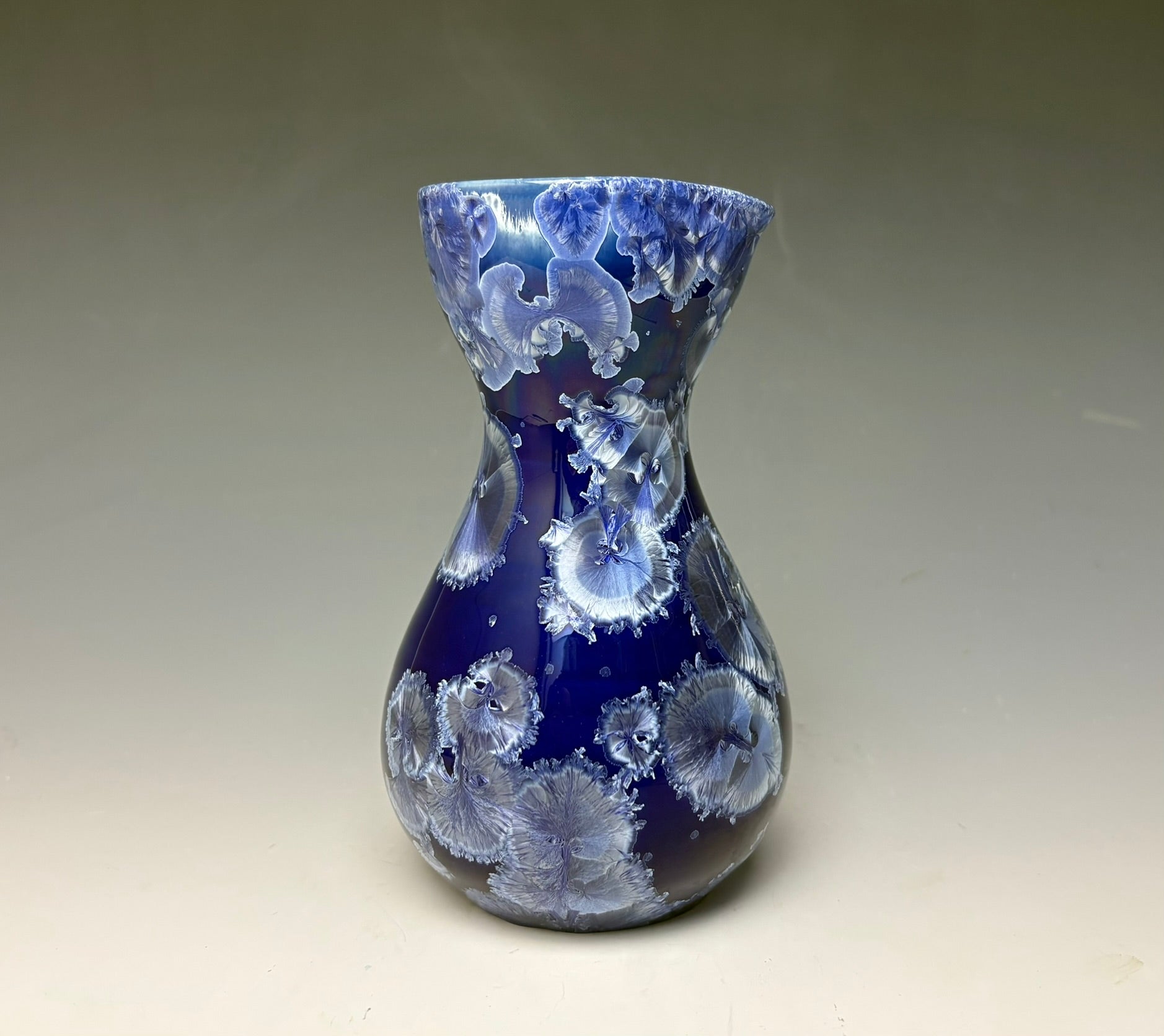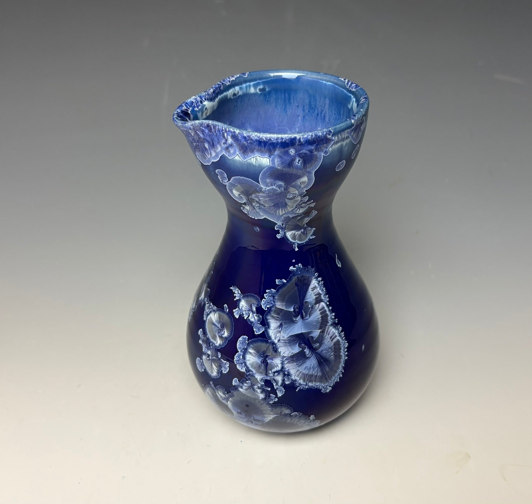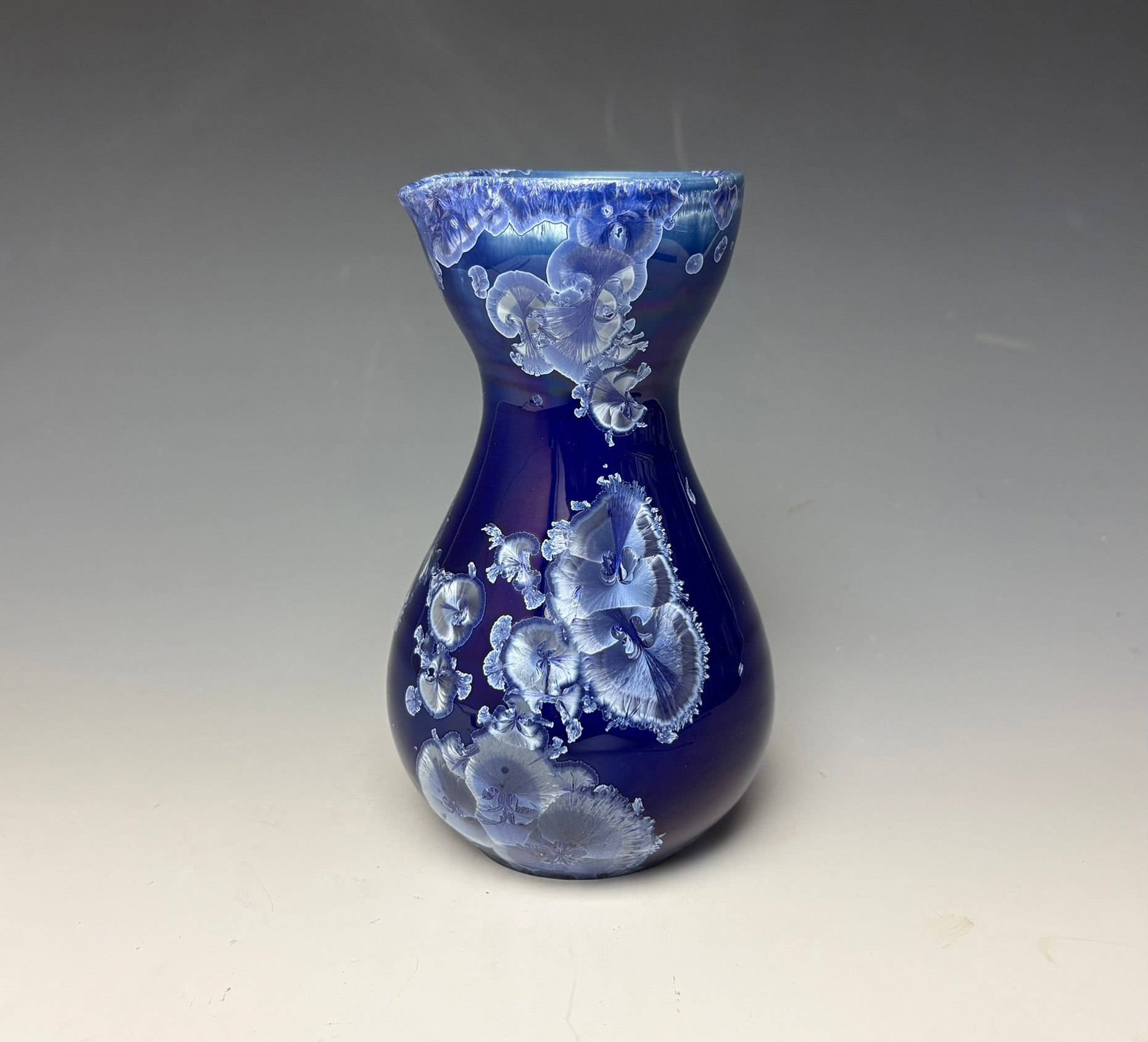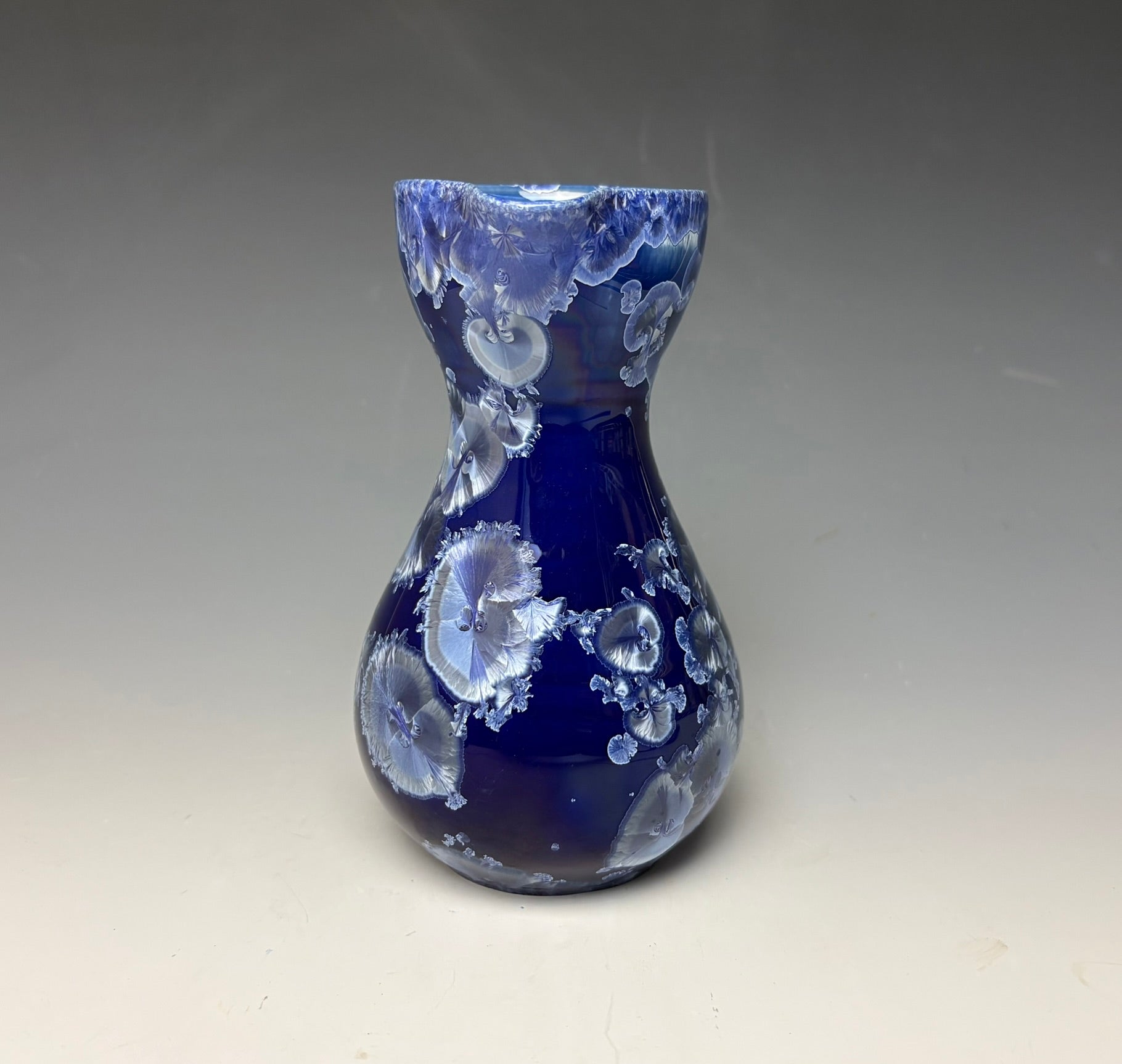 This piece was hand made on the potter’s wheel from porcelain clay. The zinc crystals covering the surface of the piece are a unique combination of silver/blue crystals on a deep royal blue background. This glaze really glows in the light!