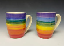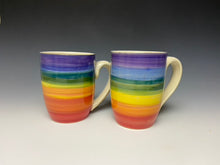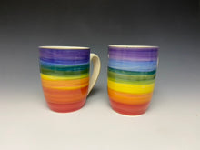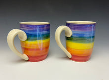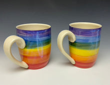 This mug was handmade on the potter's wheel by Lindsey from stoneware clay. The rainbow pattern was painted onto the clay on the mug before firing. The interior of the mug has clear glaze.