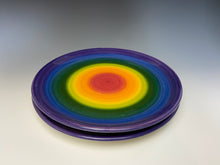 The piece was made by Lindsey from stoneware clay on the potters wheel. The rainbow pattern was painted on with underglaze at the leather hard stage. It was glaze fired to over 2200 degrees.