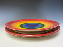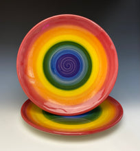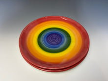 The piece was made by Lindsey from stoneware clay on the potters wheel. The rainbow pattern was painted on with underglaze at the leather hard stage. It was glaze fired to over 2200 degrees.