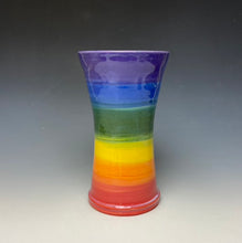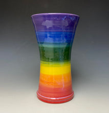 The piece was made by Lindsey from stoneware clay on the potters wheel. The rainbow pattern was painted on with underglaze at the leather hard stage. It was glaze fired to over 2200 degrees.