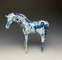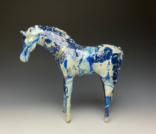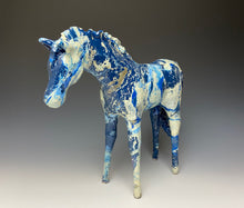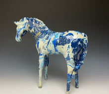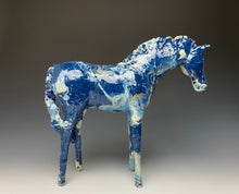 This horse is handmade completely from clay. After forming the horse, it was carefully dried and fired to over 1900°F. The blue, white & gold marble pattern was painted onto the horse and sealed with museum quality resin.