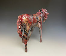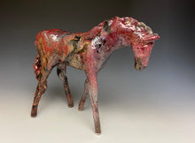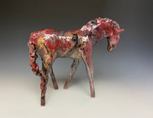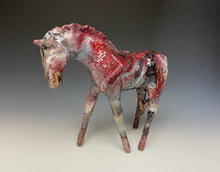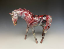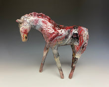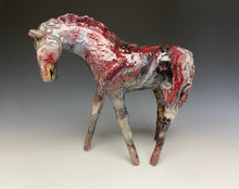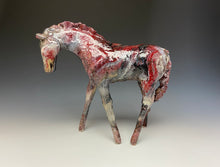 This horse is handmade completely from clay. After forming the horse, it was carefully dried and fired to over 1900°F. The red, black, white & gold marble pattern was painted onto the horse and sealed with museum quality resin.