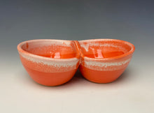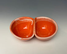 The dish was hand made on the potters wheel from stoneware clay by Lindsey from two separate dishes that were joined together. After the initial bisque firing, it was glazed in my intense orange glaze which has white hints cascading over the edges.