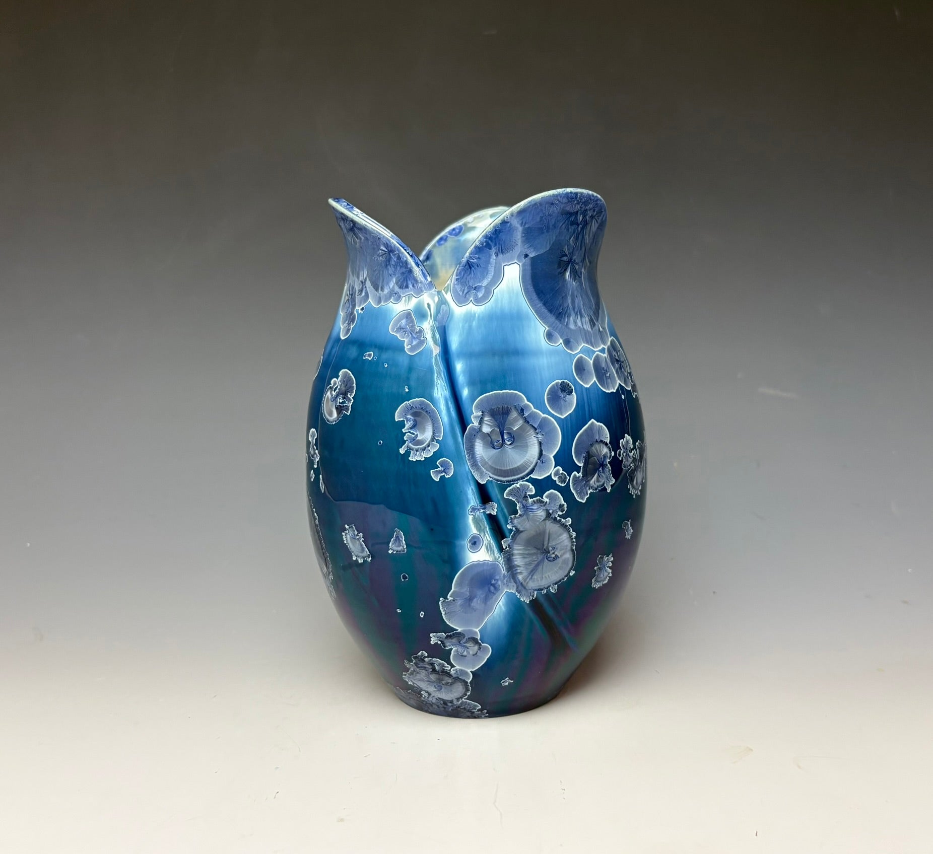 The glaze on this vase is my "Atlantic Blue crystalline glaze. The background is a navy blue and white color with slivery blue crystals on the surface. The depth and dimension in the glaze are quite stunning- the crystals seem to move and dance about the surface of the vase as the light hits it. You can sit for hours looking at the vase, finding new patterns and designs that the crystals have created during their growing process.