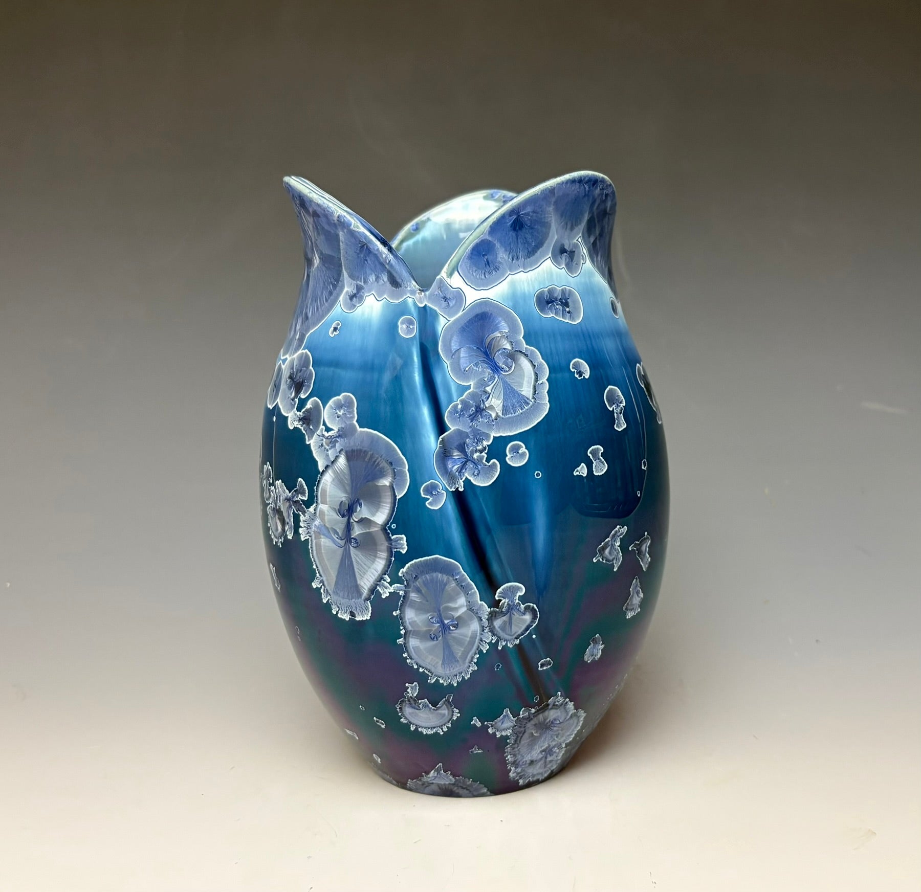 This vase was hand-made from porcelain clay on the potter's wheel. The clay was cut and altered to create the tulip-like shape. Due to the unique nature of crystalline glazes, no two pieces are ever alike. The zinc crystals are actually grown during the firing and cooling process. The time and temperature must be accurate in order to achieve crystal growth on the piece.