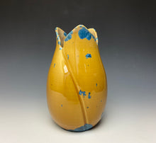 The glaze on this vase has a few small royal blue crystals which jump off the orange background. The depth and dimension in the glaze are quite stunning- the crystals seem to move and dance about the surface of the vase as the light hits it. You can sit for hours looking at the vase, finding new patterns and designs that the crystals have created during their growing process.