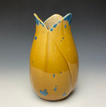 This vase was hand-made from porcelain clay on the potter's wheel. The clay was cut and altered to create the tulip-like shape. Due to the unique nature of crystalline glazes, no two pieces are ever alike. The zinc crystals are actually grown during the firing and cooling process. The time and temperature must be accurate in order to achieve crystal growth on the piece.