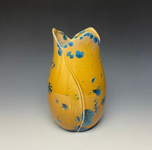 This vase was hand-made from porcelain clay on the potter's wheel. The clay was cut and altered to create the tulip-like shape. Due to the unique nature of crystalline glazes, no two pieces are ever alike. The zinc crystals are actually grown during the firing and cooling process. The time and temperature must be accurate in order to achieve crystal growth on the piece.