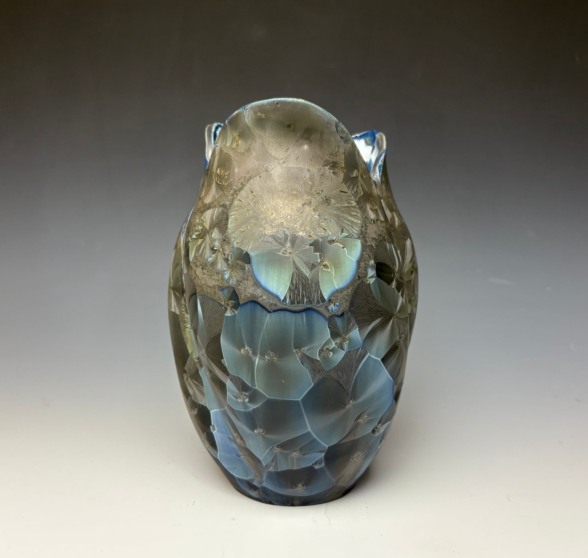 The glaze on this vase is my Cobalt Galaxy crystalline glaze. The background is a blue and silver color with slivery blue/green crystals on the surface. The depth and dimension in the glaze are quite stunning- the crystals seem to move and dance about the surface of the vase as the light hits it. You can sit for hours looking at the vase, finding new patterns and designs that the crystals have created during their growing process.