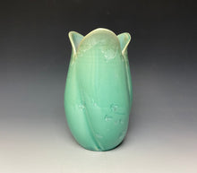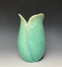 The glaze on this vase is my 'light green' crystalline glaze. The background is a light green color with light green crystals on the surface. The depth and dimension in the glaze are quite stunning- the crystals seem to move and dance about the surface of the vase as the light hits it. You can sit for hours looking at the vase, finding new patterns and designs that the crystals have created during their growing process.