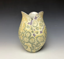This vase was hand-made from porcelain clay on the potter's wheel. The clay was cut and altered to create the tulip-like shape. Due to the unique nature of crystalline glazes, no two pieces are ever alike. The zinc crystals are actually grown during the firing and cooling process. The time and temperature must be accurate in order to achieve crystal growth on the piece.