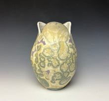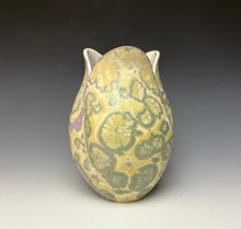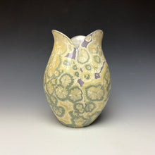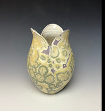 The glaze on this vase is my "Unicorn" crystalline glaze. The background is a light purple color with golden crystals on the surface. The depth and dimension in the glaze are quite stunning- the crystals seem to move and dance about the surface of the vase as the light hits it. You can sit for hours looking at the vase, finding new patterns and designs that the crystals have created during their growing process.