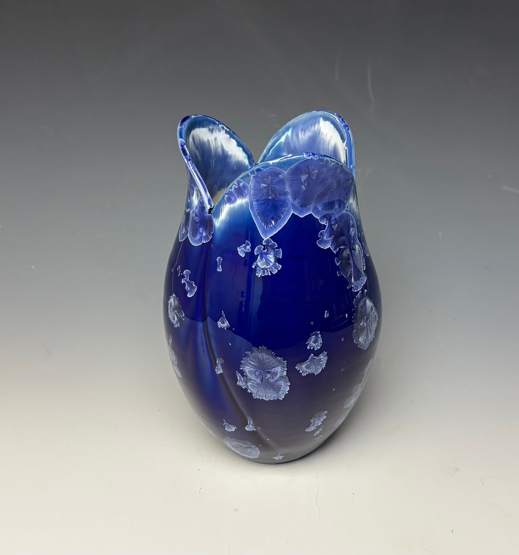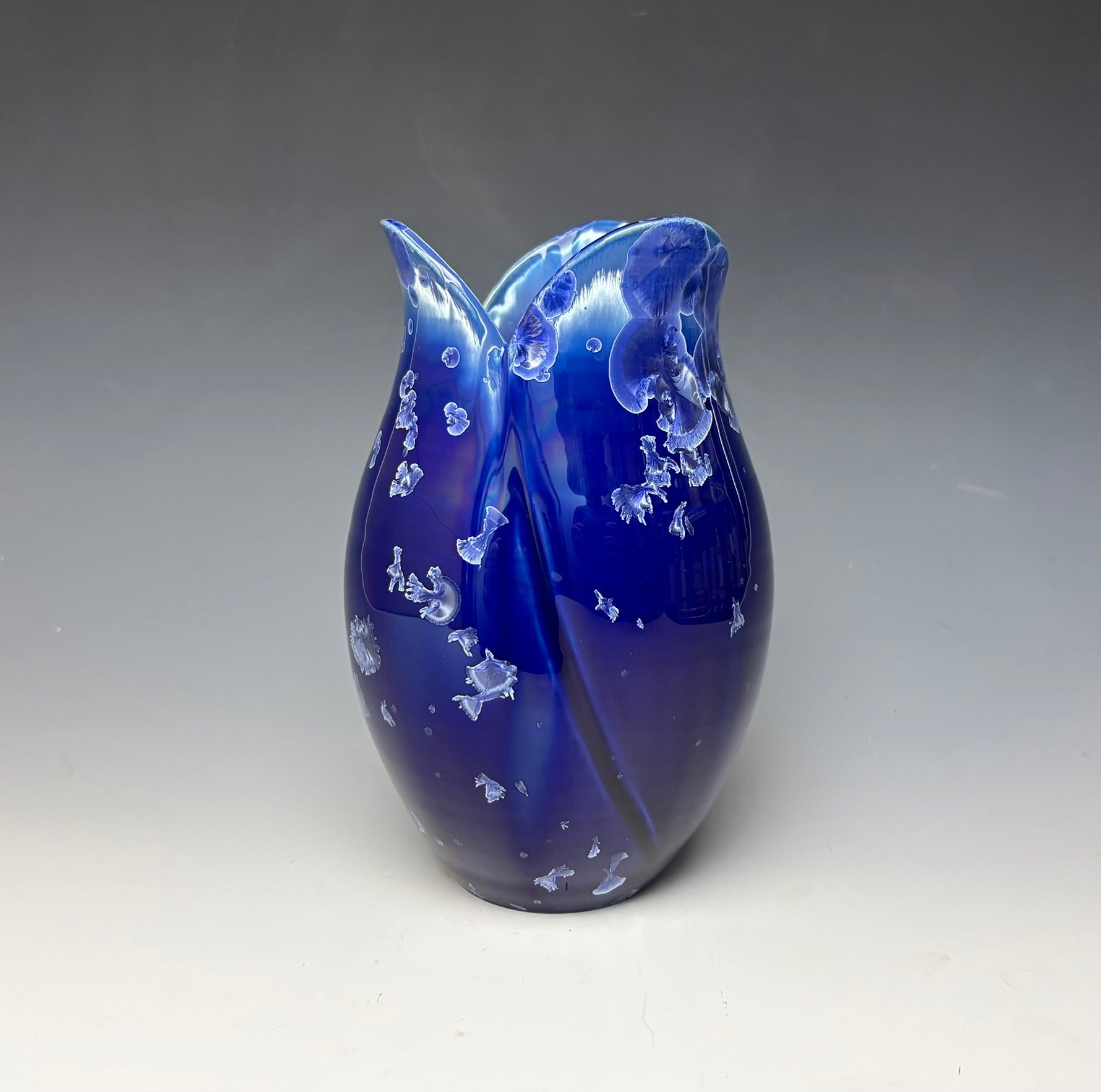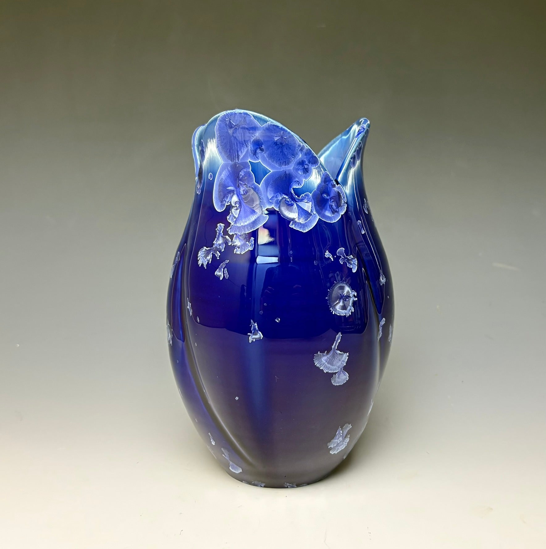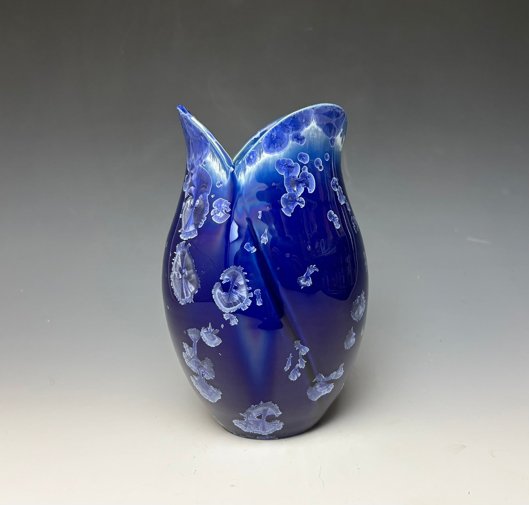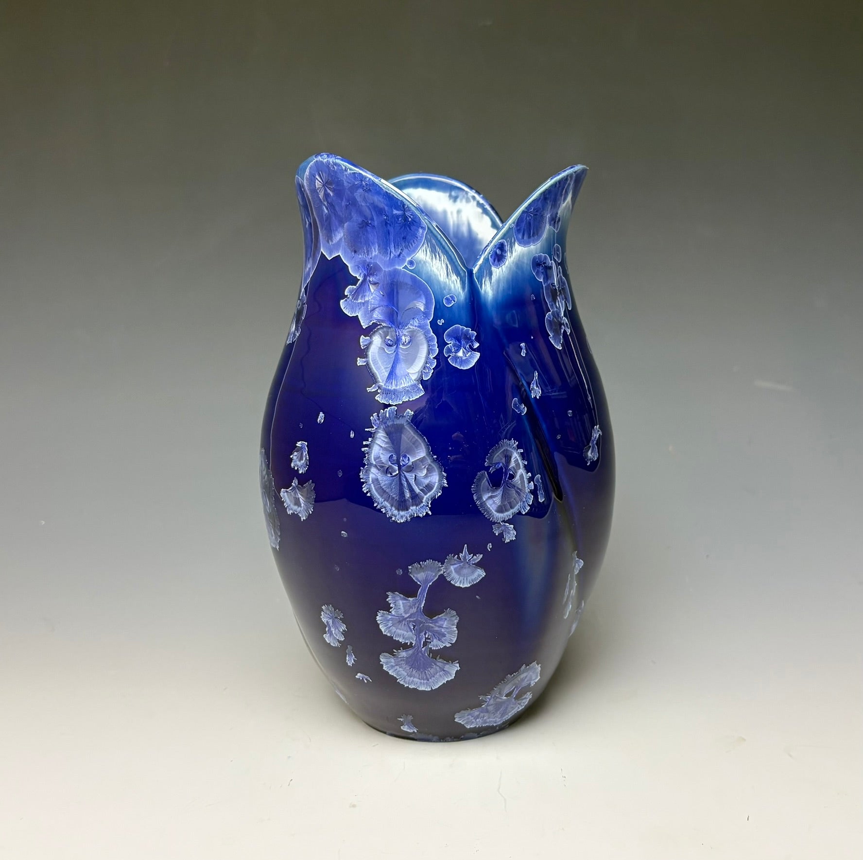 This vase was hand-made from porcelain clay on the potter's wheel. The clay was cut and altered to create the tulip-like shape. Due to the unique nature of crystalline glazes, no two pieces are ever alike. The zinc crystals are actually grown during the firing and cooling process. The time and temperature must be accurate in order to achieve crystal growth on the piece.