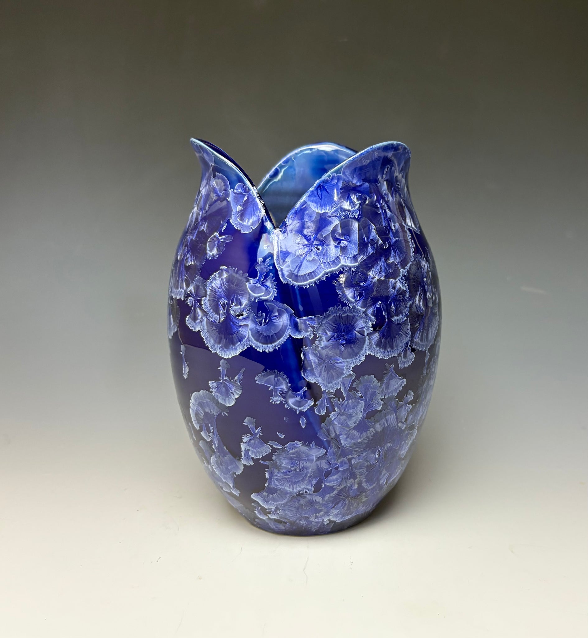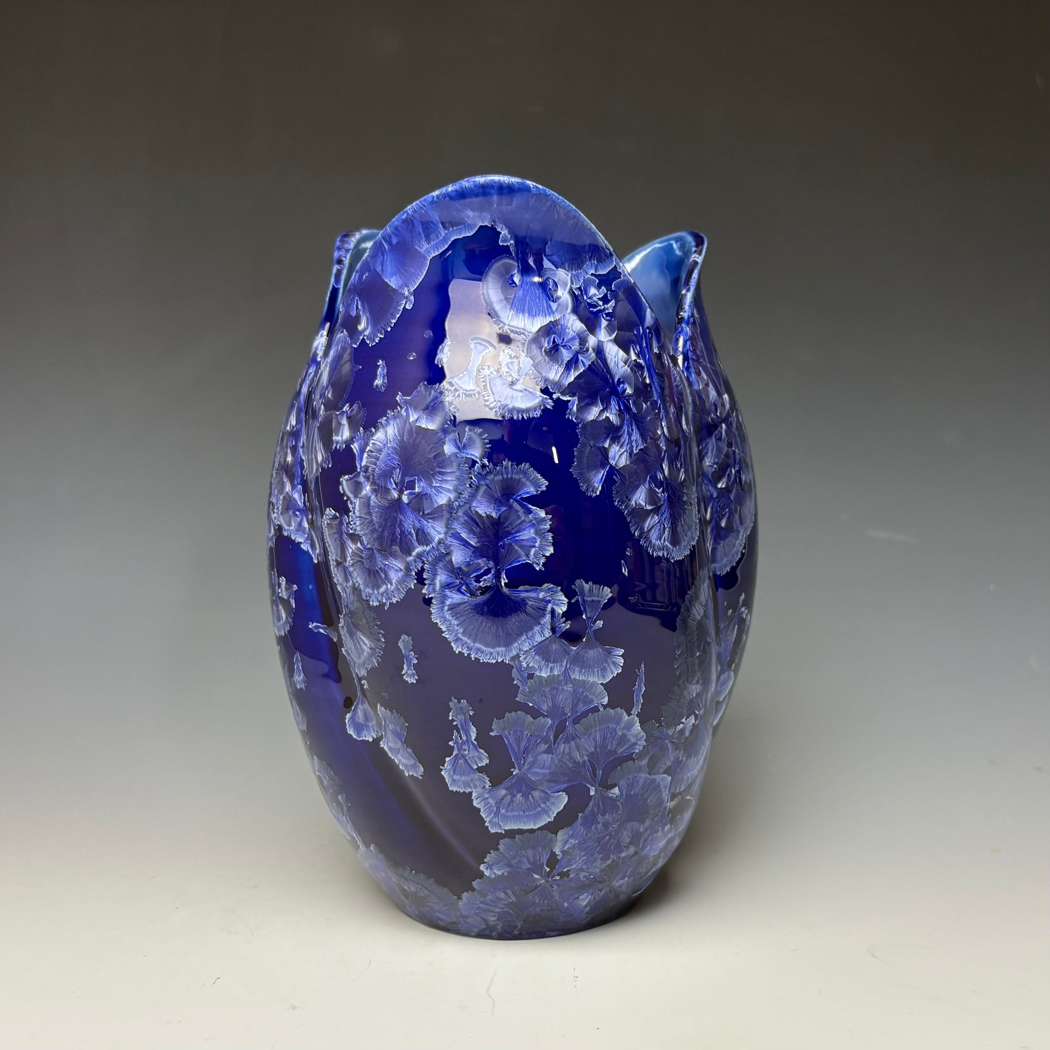 This vase was hand-made from porcelain clay on the potter's wheel. The clay was cut and altered to create the tulip-like shape. Due to the unique nature of crystalline glazes, no two pieces are ever alike. The zinc crystals are actually grown during the firing and cooling process. The time and temperature must be accurate in order to achieve crystal growth on the piece.