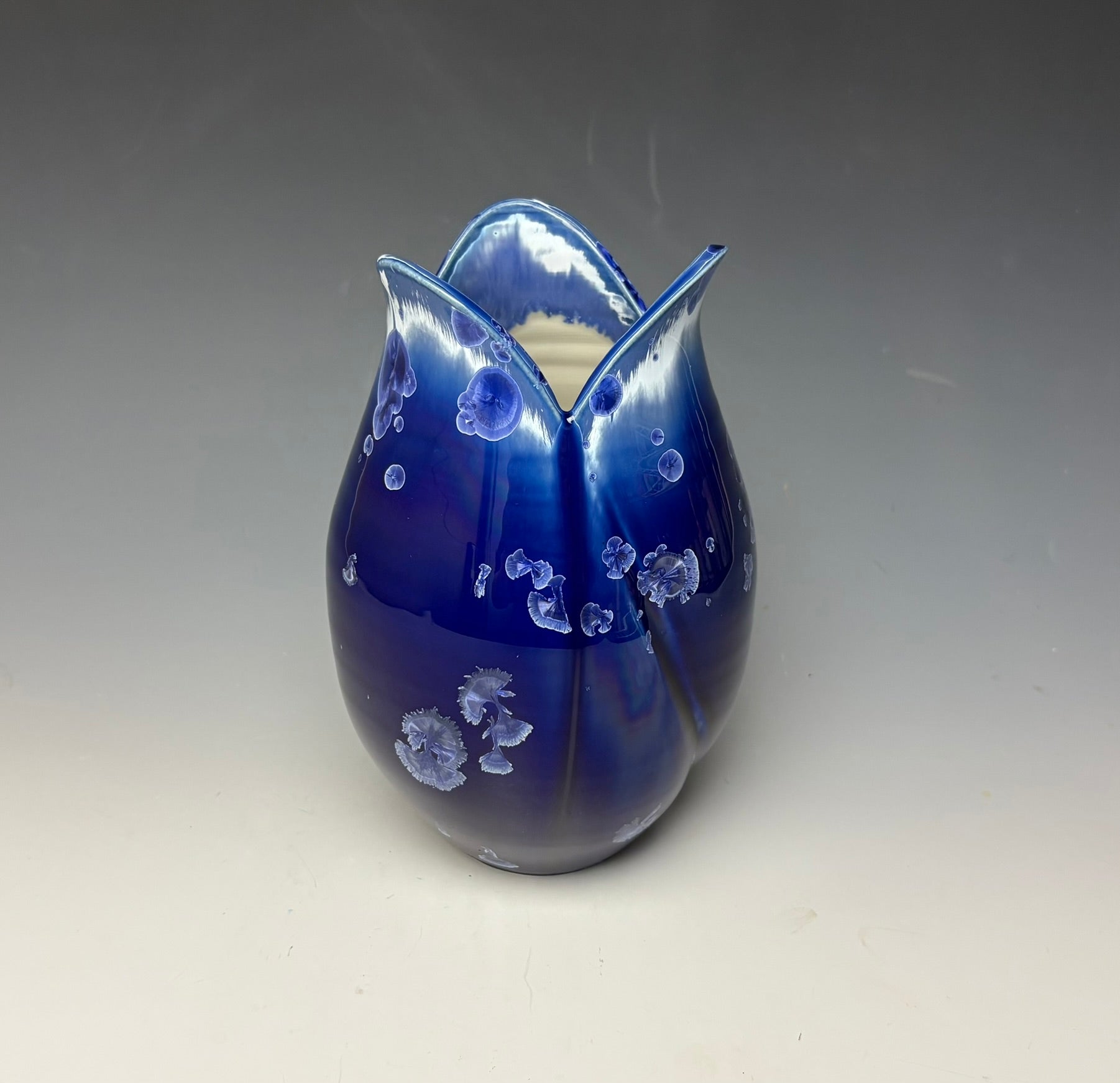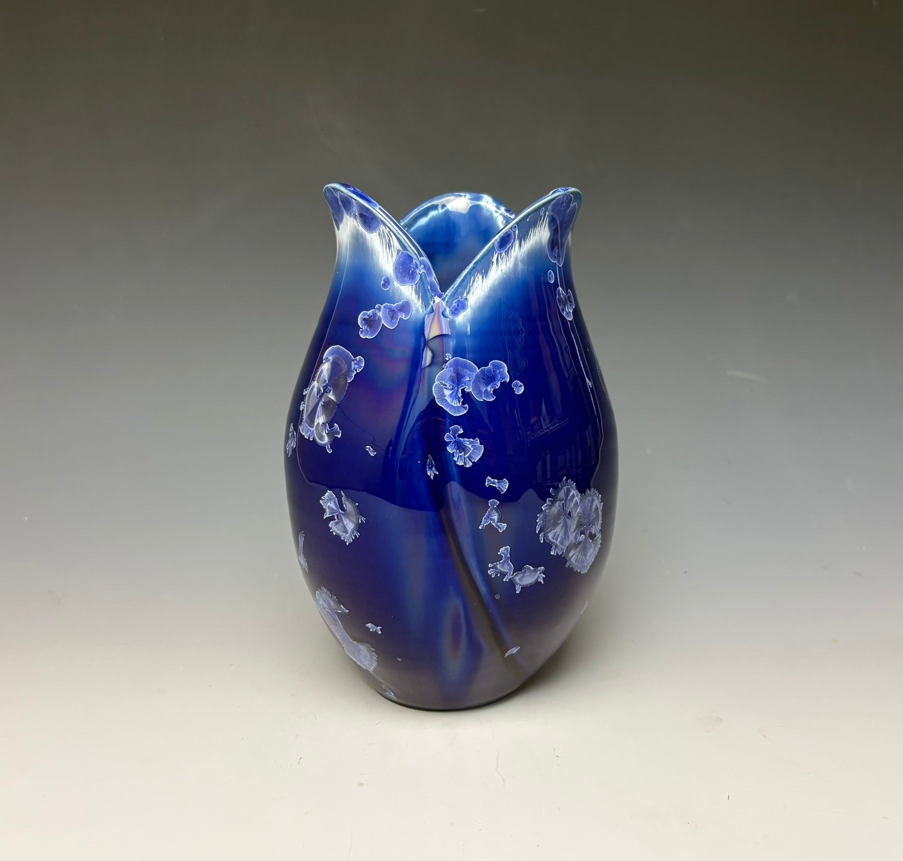 This vase was hand-made from porcelain clay on the potter's wheel. The clay was cut and altered to create the tulip-like shape. Due to the unique nature of crystalline glazes, no two pieces are ever alike. The zinc crystals are actually grown during the firing and cooling process. The time and temperature must be accurate in order to achieve crystal growth on the piece.