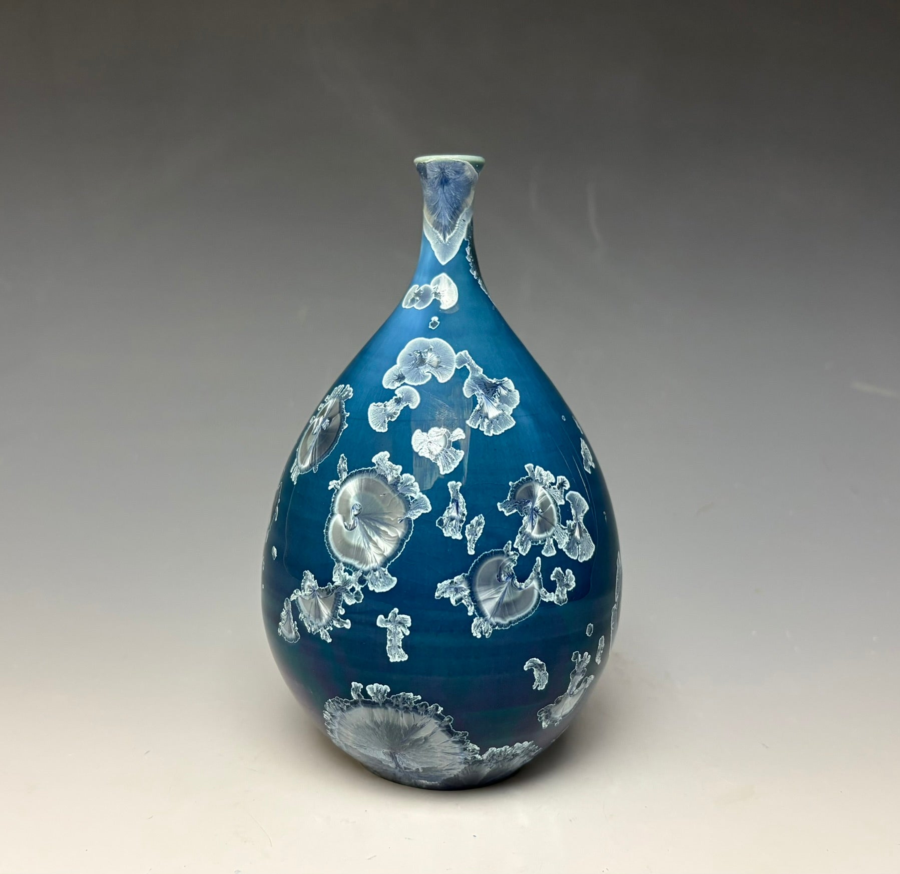 The piece has lovely deep blue/silver zinc crystals on a deep blue and white background. These crystals actually GROW during the firing and cooling process! No two pieces are ever alike. The bright blue crystals have a silver shimmer and dance about the dark blue/white satiny background.
